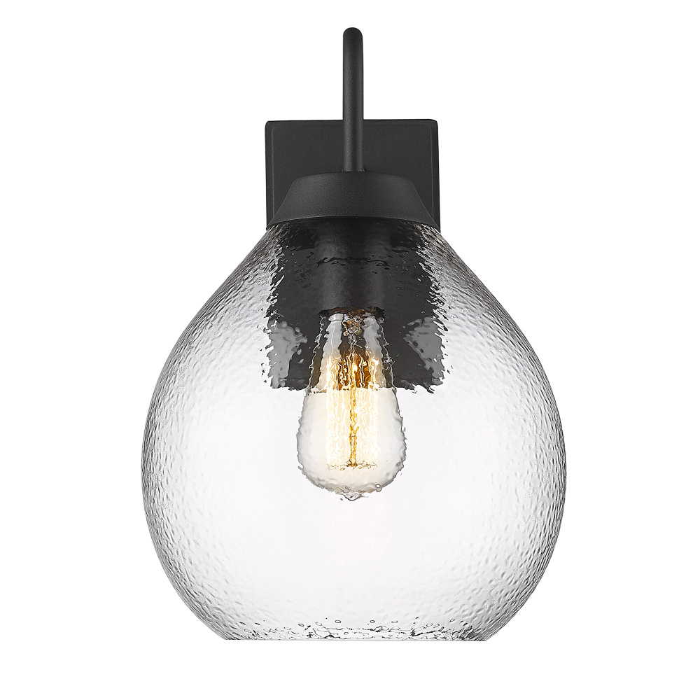 Bring transitional elegance to your exterior with the Golden Lighting Ariella 1-light Outdoor Wall in Natural Black. Featuring a glass shade and a natural black frame, it creates a welcoming atmosphere. The glass shade, skillfully hammered, creates beautiful light refractivity, adding a rustic touch to your outdoor spaces. The natural black finish delivers a uniquely soft, organic look, allowing this fixture to complement a wide range of styles, from modern farmhouse to industrial. Functional and inviting at entryways or patios, this wall light is wet location rated for direct exposure to the elements, ensuring durability and reliability. Overall Dimensions: 9.88"W x 14.75"H x 12"D. Requires 1 E26 Medium base bulb (not included). Max 100 wattage per bulb. Transform your outdoor spaces with this stylish light that beautifully combines form and function.
