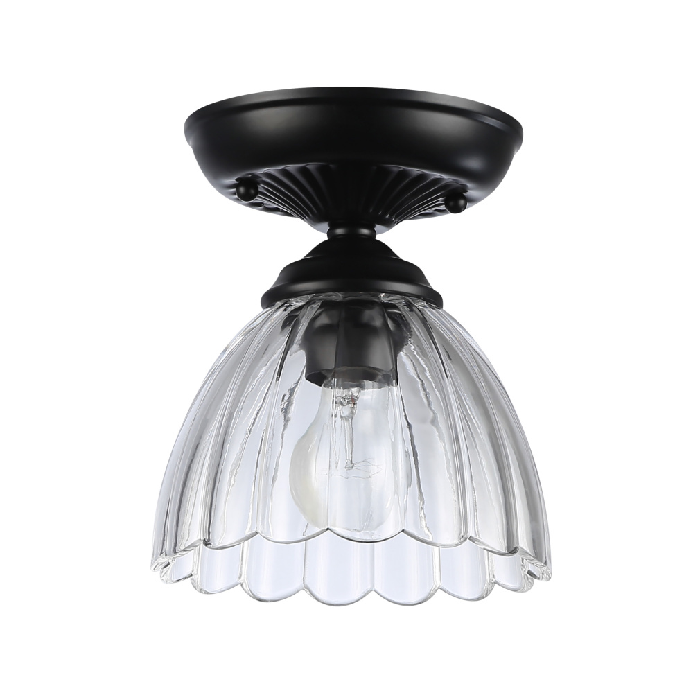 Bring sophisticated elegance into your home with the Golden Lighting Audra 1-light 7in Semi-Flush Mount. Featuring a glass shade and a Matte Black frame, it creates a warm and inviting atmosphere. The clear glass shade provides brilliant, unobstructed light, polished to a high-gloss shine that beautifully highlights the bulbs and fixture design. Suitable for various styles, from minimalist to bold contemporary, this fixture ensures maximum illumination without distraction. The Matte Black finish embodies clean modern style, offering a timeless, versatile appeal that enhances your decor with a strong graphic presence. The sleek and smooth surface perfectly complements any interior design. With a damp location rating, this fixture is ideal for areas with occasional moisture, such as bathrooms and covered porches. It fits seamlessly into entryways, kitchens, and living areas with mid-height ceilings. Overall Dimensions: 6.88"W x 8"H x 6.88"D. Requires 1 E26 Medium base bulb (not included) with a maximum wattage of 60. Elevate your home’s decor with this chic flush mount!