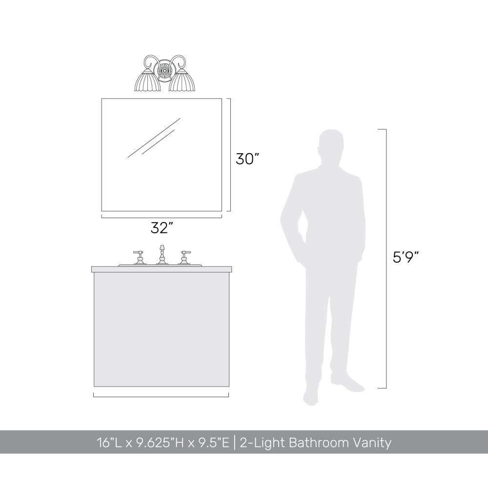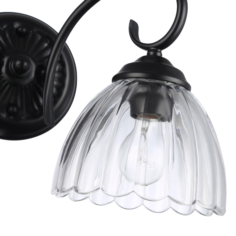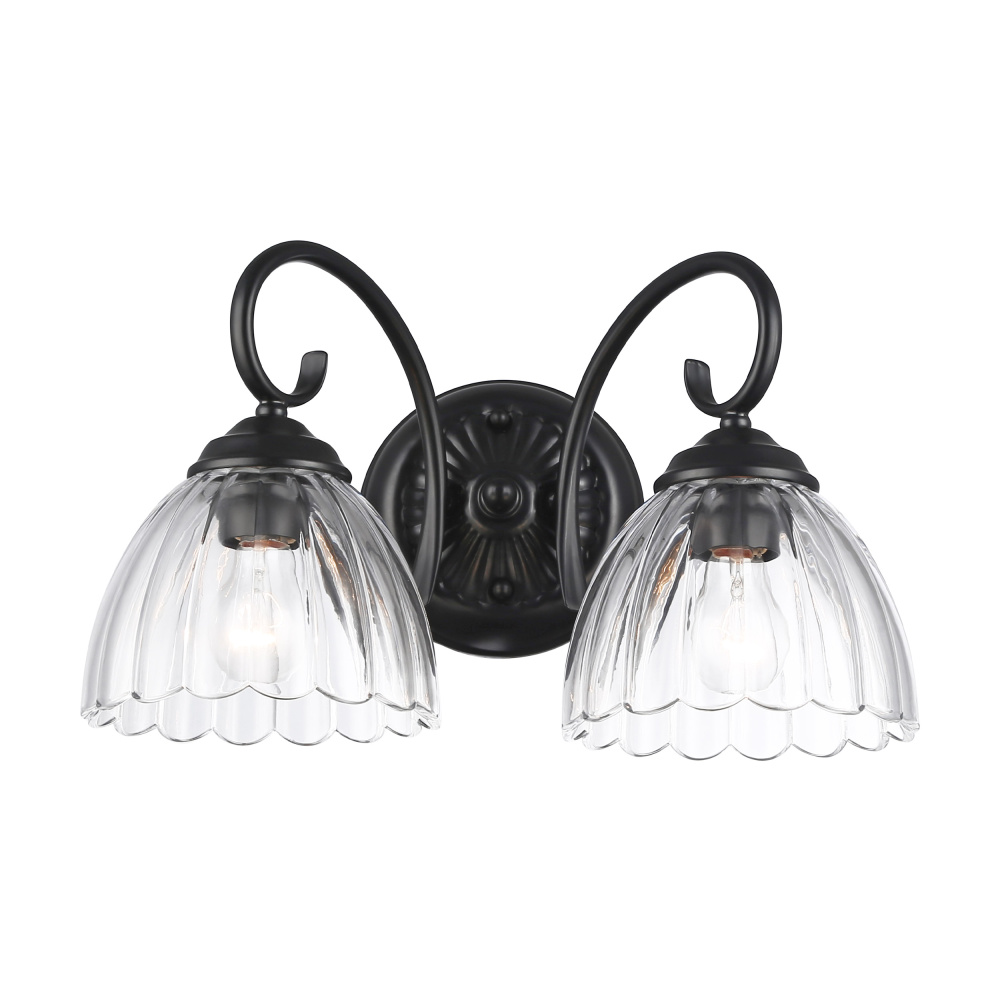 Bring glamorous elegance into your home with the Golden Lighting Audra 2-light Vanity in Matte Black. Featuring a glass shade and a matte black frame, it creates a welcoming atmosphere. The clear glass shade features completely transparent, colorless glass with a smooth, polished, and glossy finish. This timeless appeal offers brilliant, unobstructed light, allowing the beauty of the bulb and the fixture's design to take center stage. The epitome of clean, modern style, our Matte Black finish is both timeless and endlessly versatile. Its deep, uniform black color has a true non-reflective matte surface that absorbs light, creating a soft, sophisticated look with a strong graphic quality. Brighten up bathrooms with dedicated lighting that flatters while providing practical task illumination. This fixture is damp location rated, making it suitable for covered and semi-enclosed spaces with occasional moisture, like bathrooms, covered porches, and laundry rooms. Overall dimensions: 16"W x 9.63"H x 9.5"D. It requires 2 E26 Medium base bulbs (not included), with a max wattage of 60 per bulb. Close this gorgeous piece with the alluring sparkle that adds a touch of luxury to your daily routine.