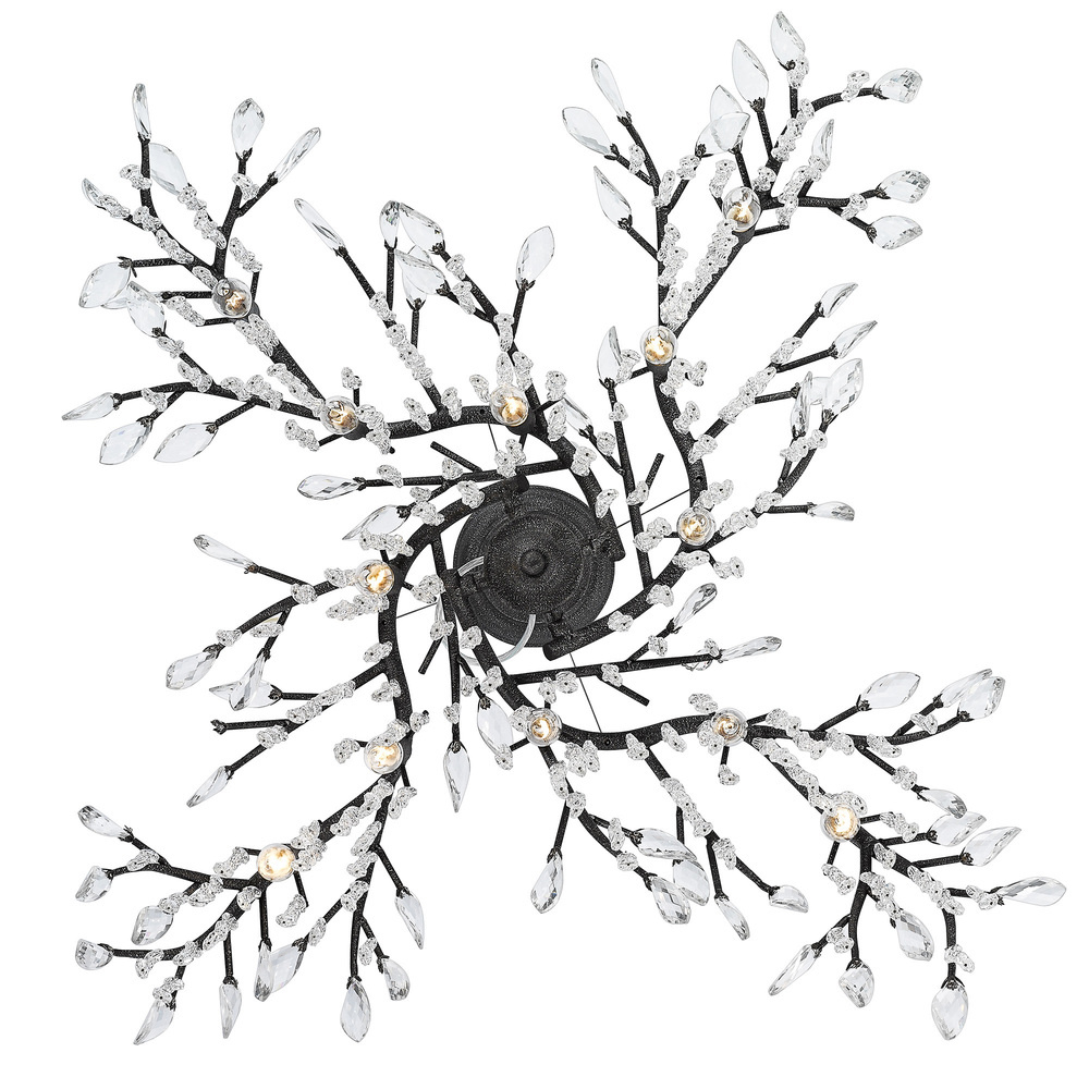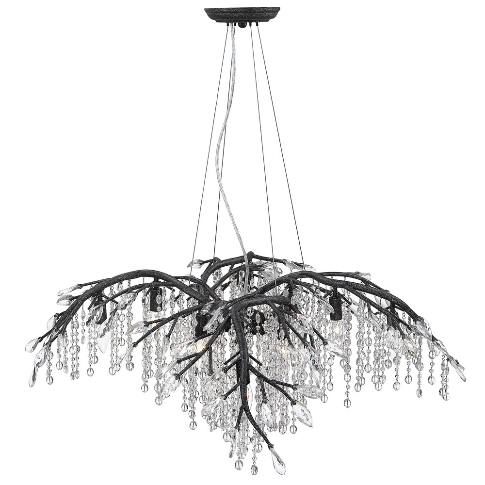 Bring organic elegance into your home with the Golden Lighting Autumn Twilight 12-light Chandelier. This stunning fixture boasts an intricate design showcasing hand-forged metal branches that resemble nature's beauty. With no shade, the chandelier features delicate crystals cascading like droplets, creating dynamic light textures. The black iron finish offers a rugged yet visually striking charm, perfect for enhancing dining rooms, foyers, and living spaces. Dry location rated for indoor use, this chandelier is easily adjustable and can be installed on sloped ceilings. Overall dimensions of 40"W x 15.5"H x 40"D require 12 E12 candelabra base bulbs (not included, max 60 wattage). Experience the unique design and quality craftsmanship that this chandelier brings to your home.