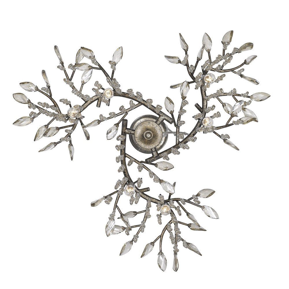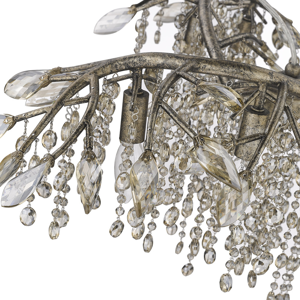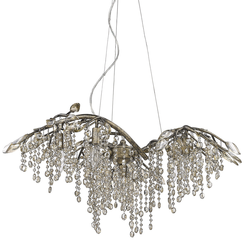 Bring Boho elegance into your home with the Golden Lighting Autumn Twilight 6-light Chandelier in Mystic Gold. This impressive chandelier creates a warm atmosphere without a shade, allowing its design to shine as the centerpiece. Delicate branches and hand-polished crystal leaves create a stunning display, beautifully capturing the essence of nature’s beauty. Our Mystic Gold finish is an old-world masterpiece, rich with drama and character, enhancing any sophisticated setting. Ideal for making a grand impression in dining rooms and foyers or elevating bedrooms, this chandelier is Dry Location Rated, perfect for indoor spaces not subject to moisture, and is sloped-ceiling compatible with Adjustable Height - Min: 17.75"- Max: 110.25". Overall Dimensions: 31"W x 14.25"H x 31"D, using 6 E12 Candelabra base bulbs (not included) with a maximum wattage of 60 each. Embrace the elegance that transforms your living space into a luxurious retreat.