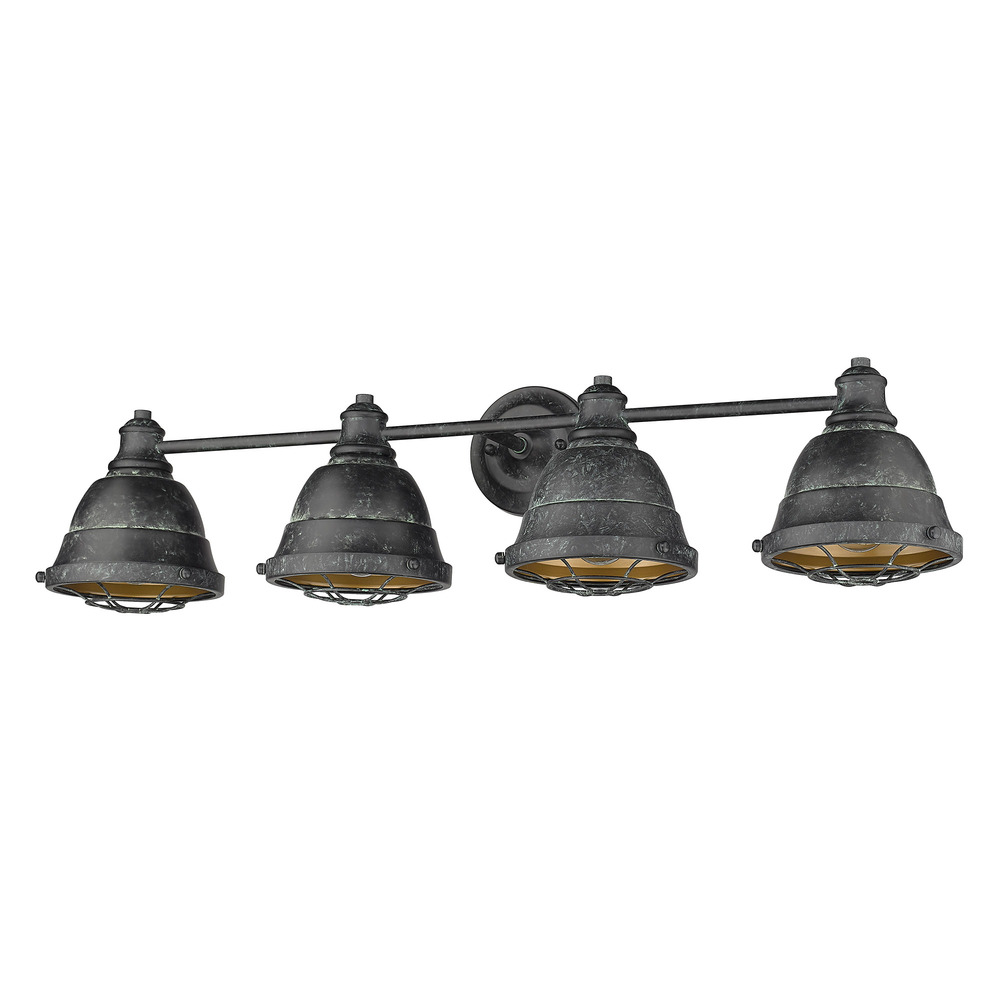 Bring industrial elegance into your home with the Golden Lighting Bartlett 4-light Vanity in Black Patina. Featuring a metal shade and a Black Patina frame, it creates a welcoming atmosphere. The elegant finish features a soft black base treated with a delicate, chalky gray wash, creating a weathered appearance that adds depth to both modern and traditional spaces. This fixture is perfect for brightening bathrooms and is Damp Location Rated, suitable for covered areas with occasional moisture. Requires 4 E26 Medium base bulbs (not included, max wattage 100) and measures 34"W x 8.5"H x 7.75"D, providing substantial illumination with classic style.