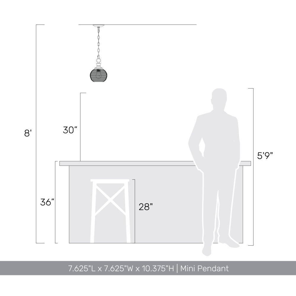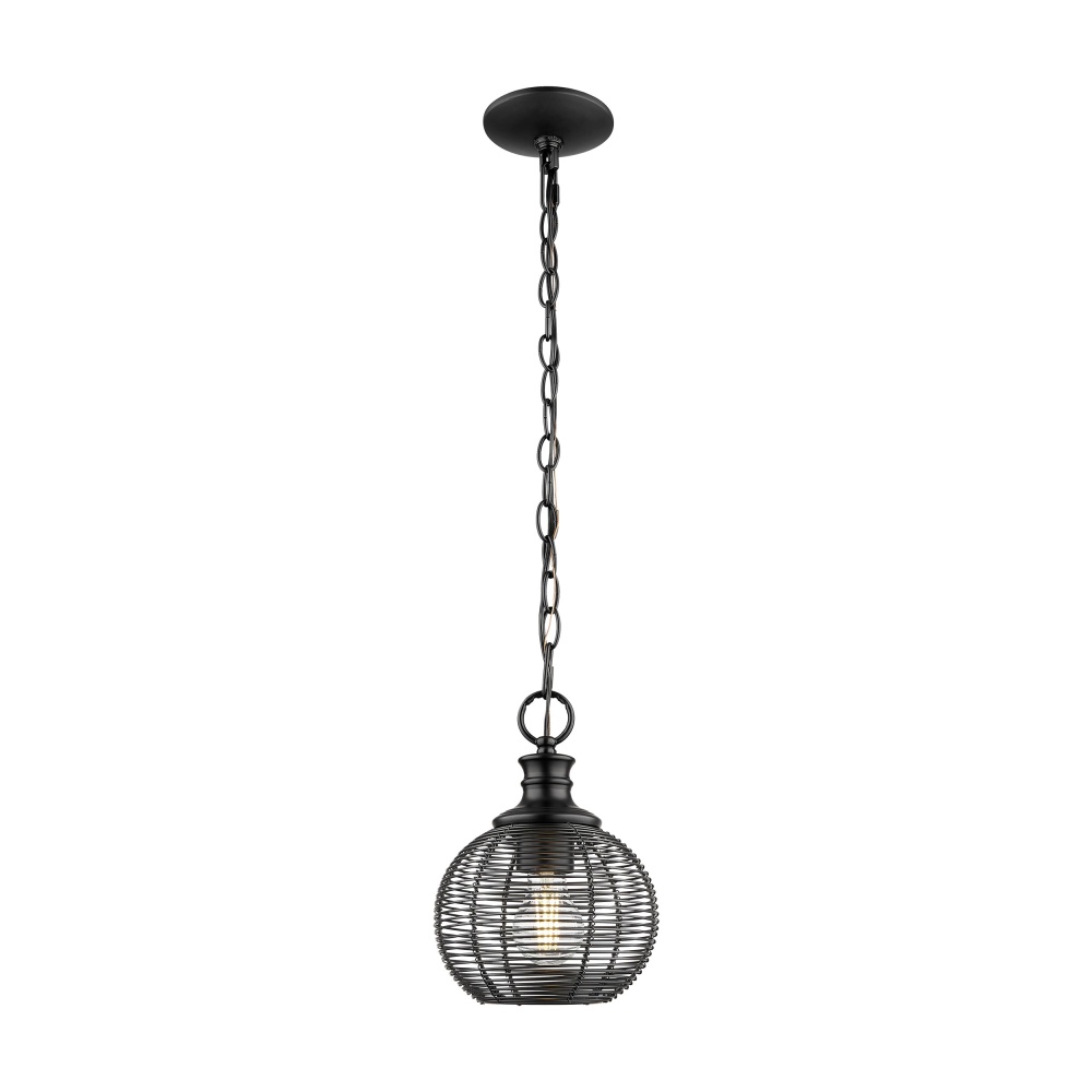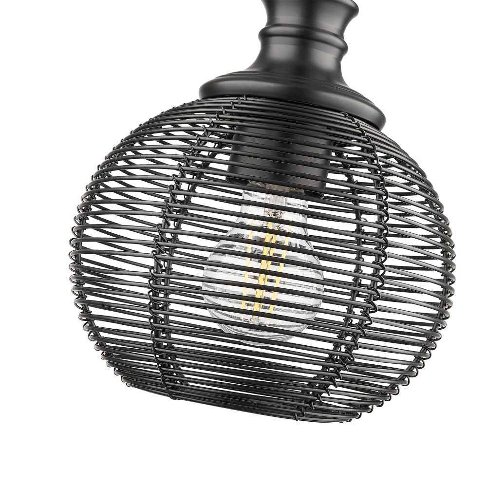 Bring industrial elegance into your home with the Golden Lighting Calypso 1-light 8in Pendant. Featuring a metal shade and a Matte Black frame, it creates a welcoming atmosphere. The metal shade incorporates a full wire mesh cage design, allowing for a chic, textural, and authentic industrial look. The matte black finish epitomizes clean style, offering a smooth touch that complements any decor. Perfect for decorative illumination in entryways, foyers, and bathrooms, this pendant is rated for damp locations, making it suitable for covered areas. Easily install on sloped ceilings and customize the hanging length (Min: 10.375"- Max: 84.5"). Dimensions: Overall Dimensions: 7.63"W x 10.38"H x 7.63"D. Requires 1 E26 Medium base bulb (not included) with a maximum wattage of 60. Enhance your space with the sophisticated charm of this pendant—where industrial design meets modern functionality.