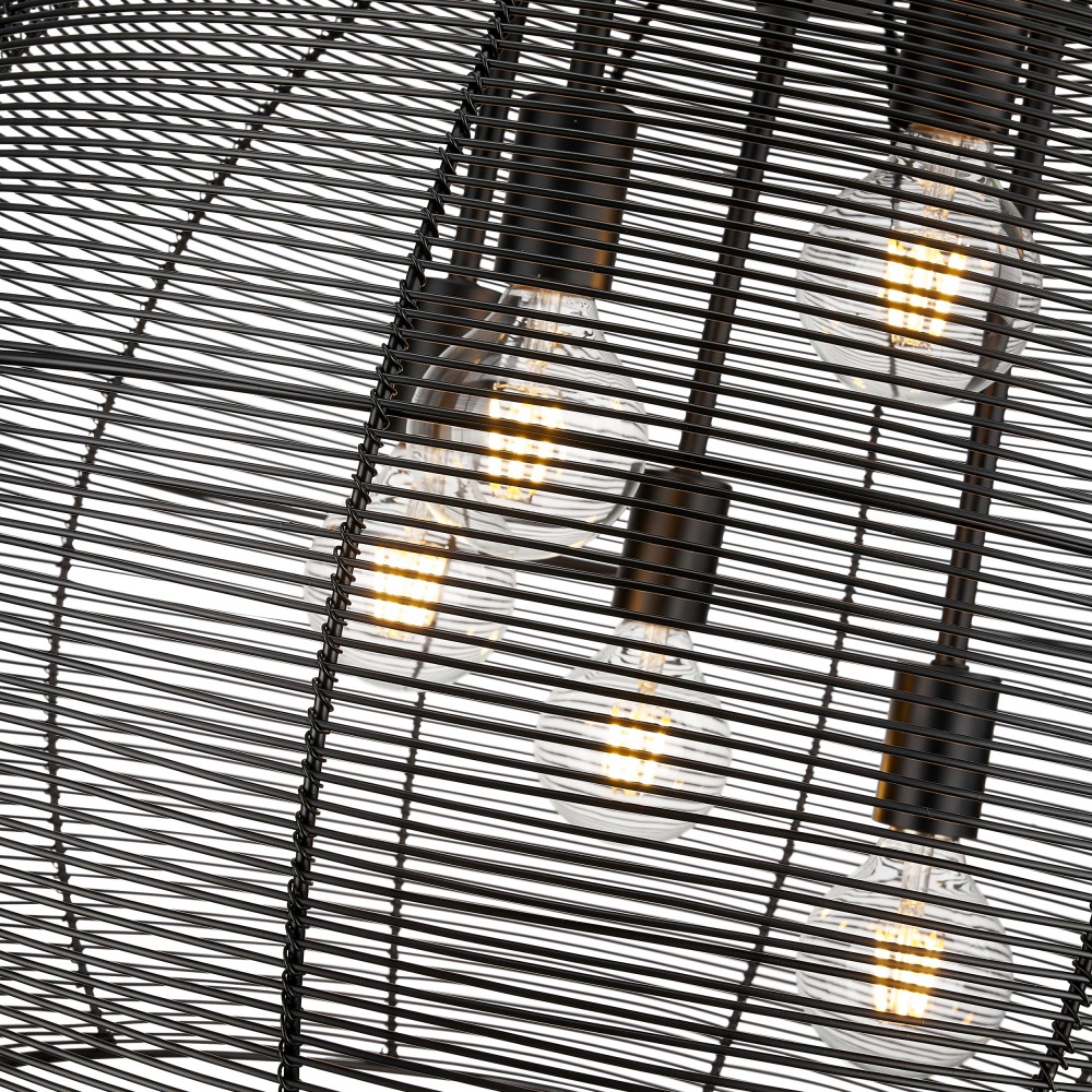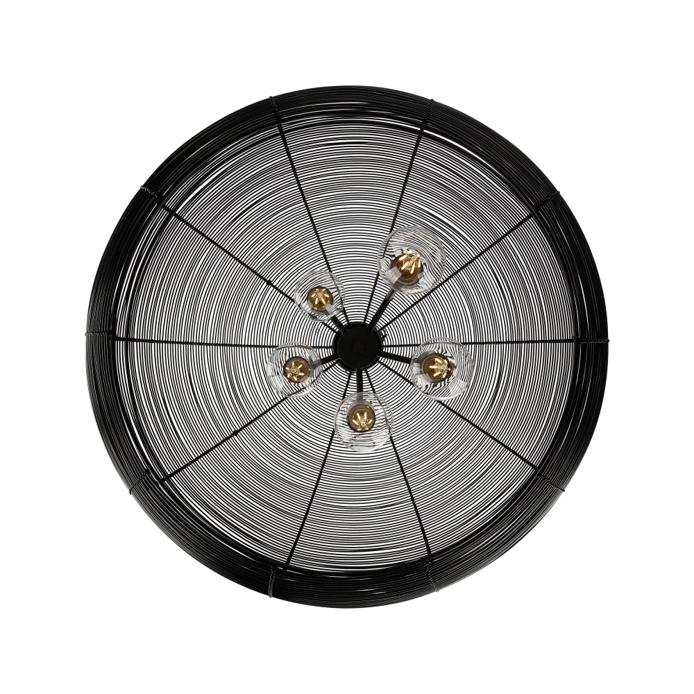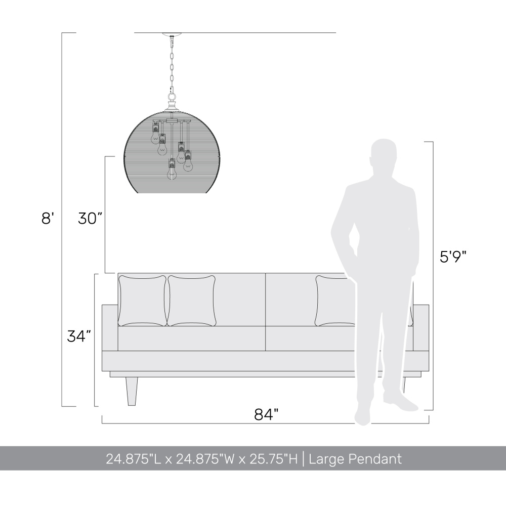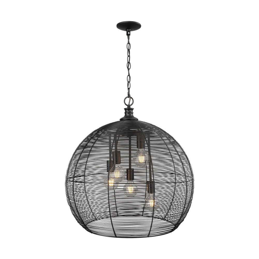 Bring industrial elegance into your home with the Golden Lighting Calypso 5-light Pendant. Featuring a metal shade and a matte black frame, it enhances any ambiance. The metal shade presents a classic matte black finish that absorbs light, maximizing the effect of the exposed bulbs for a warm, inviting glow. This combination adds sophistication and texture to any setting. The timeless matte black finish is endlessly versatile, serving as the perfect foundation for a cohesive interior aesthetic. Ideal for stylish statement-making in kitchens, dining rooms, and entryways, this pendant is Dry Location Rated, designed for indoor spaces not subject to moisture. It is sloped-ceiling compatible and adjustable in height, ranging from 25.75" to 100". This pendant requires five E26 Medium base bulbs (not included) with a maximum wattage of 60. Overall dimensions are 24.88"W x 25.75"H x 24.88"D, providing focused illumination while enhancing your decor. Elevate your home with a stunning lighting solution that reflects quality and style.