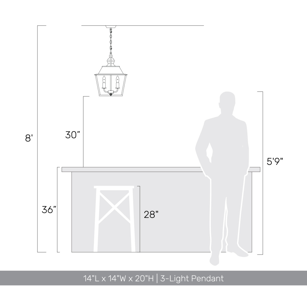 Bring timeless elegance into your home with the Golden Lighting Christoff 3-light Pendant. Featuring an antique black iron finish, it creates a welcoming atmosphere. Its classic lantern silhouette without a shade allows for bold light transmission, perfectly complementing the weathered character of the antique black iron finish, which reveals glimpses of a warm, antiqued gold base, enhancing the rustic charm. Ideal for dry location spaces, it is perfect for areas not subject to moisture, such as bedrooms, living rooms, and hallways. The convertible design offers adjustable heights from 23.5" to 97", allowing for installation as either a pendant or semi-flush mount. Overall Dimensions: 14"W x 20"H x 14"D. Requires 3 E12 Candelabra base bulbs (not included), max wattage 60 per bulb. Illuminate your home with this exquisite pendant, showcasing craftsmanship that elevates any interior space.