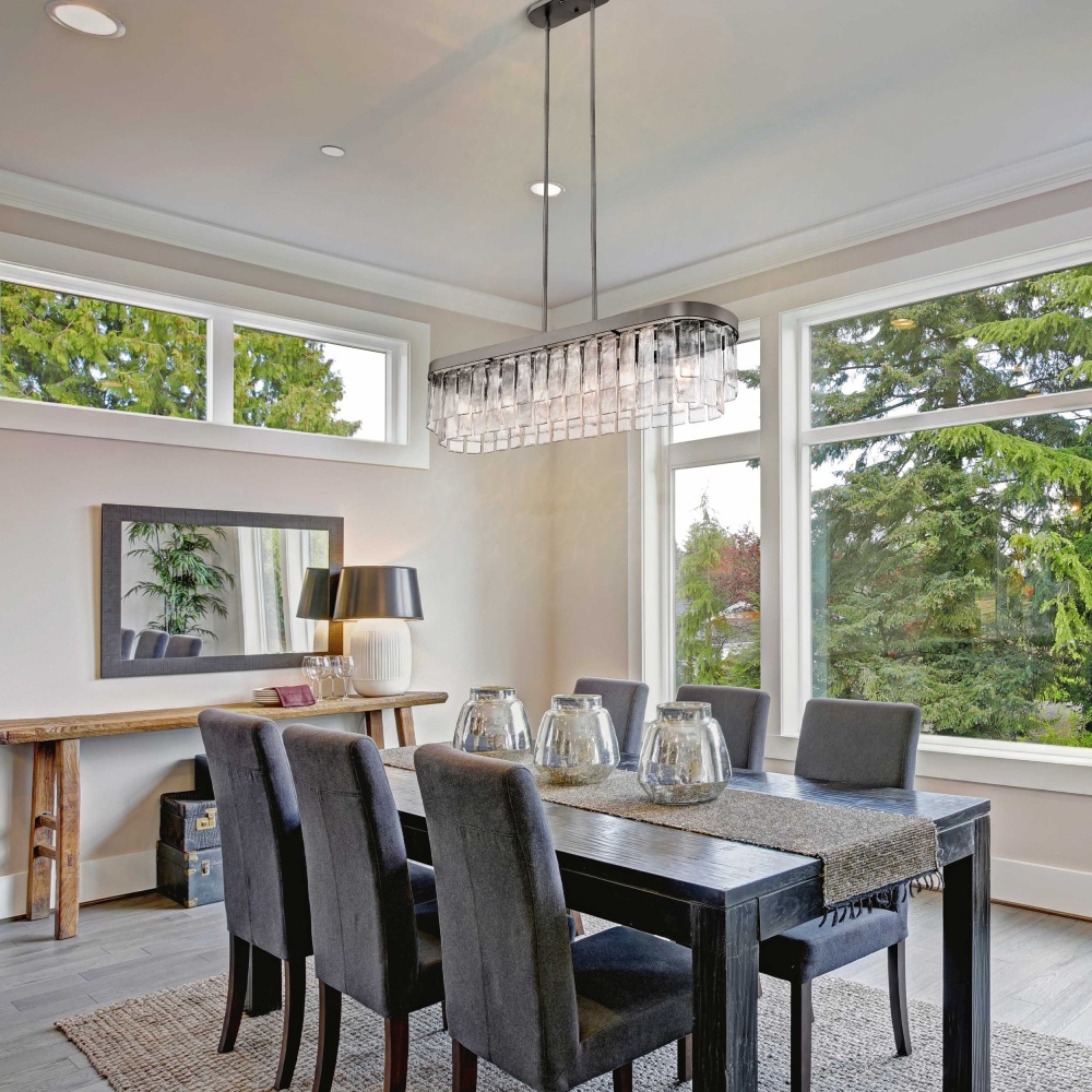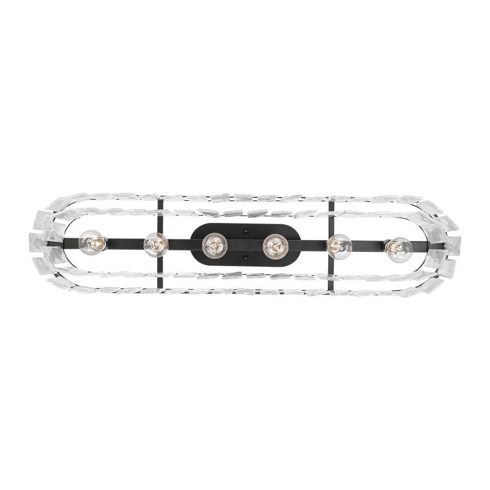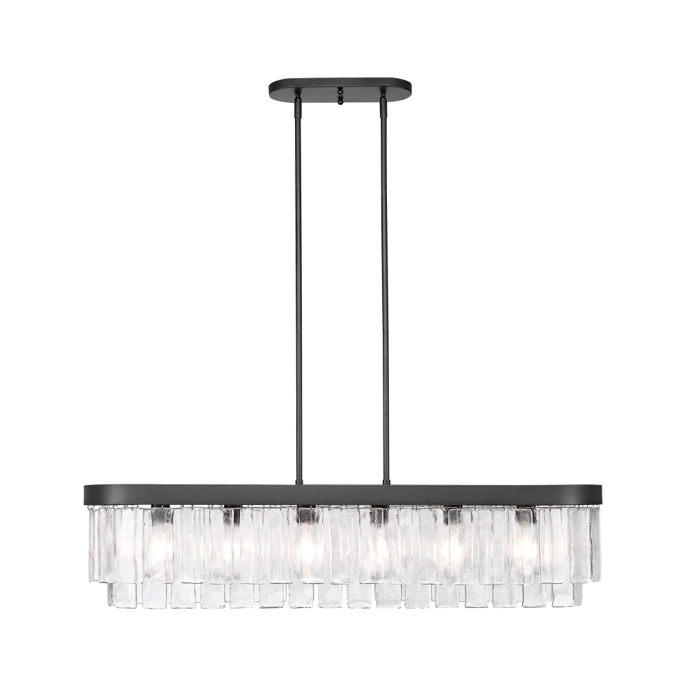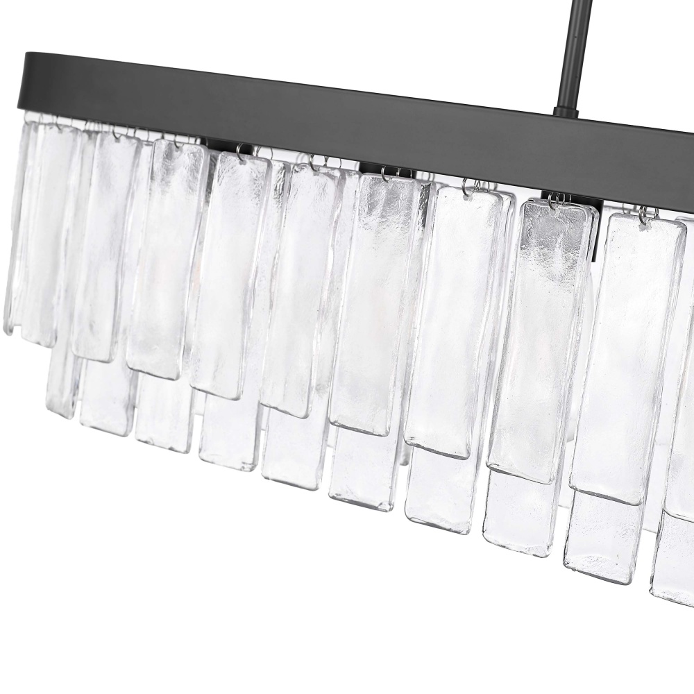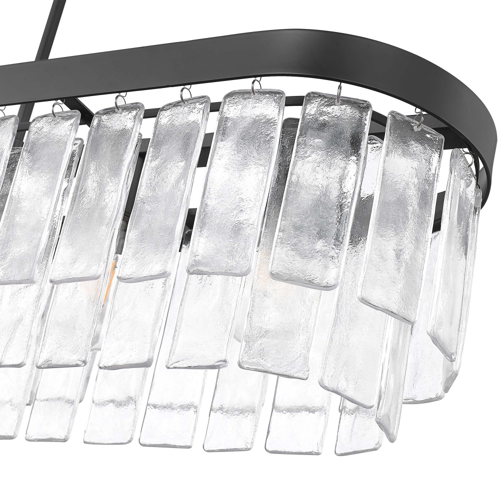 Bring Glam elegance into your home with the Golden Lighting Ciara 6-light Island Light in Matte Black. Featuring a glass shade and a Matte Black frame, it creates an impressive atmosphere. The exquisite hammered water glass shade celebrates elemental beauty, providing a beautifully distorted light effect. Each piece captures the dynamic essence of water, meticulously crafted to create intricate patterns and glows. The sleek Matte Black finish embodies clean, modern style, offering versatility that fits any decor. Tailored for kitchen islands, this damp location rated fixture can be easily installed as a semi-flush mount or pendant with adjustable height tailored for your space. Overall dimensions are 42"W x 10"H x 10"D, requiring 6 E26 medium base bulbs (not included) with a maximum wattage of 60 per bulb. Transform your kitchen ambiance with superior quality and stunning design from the Ciara collection.