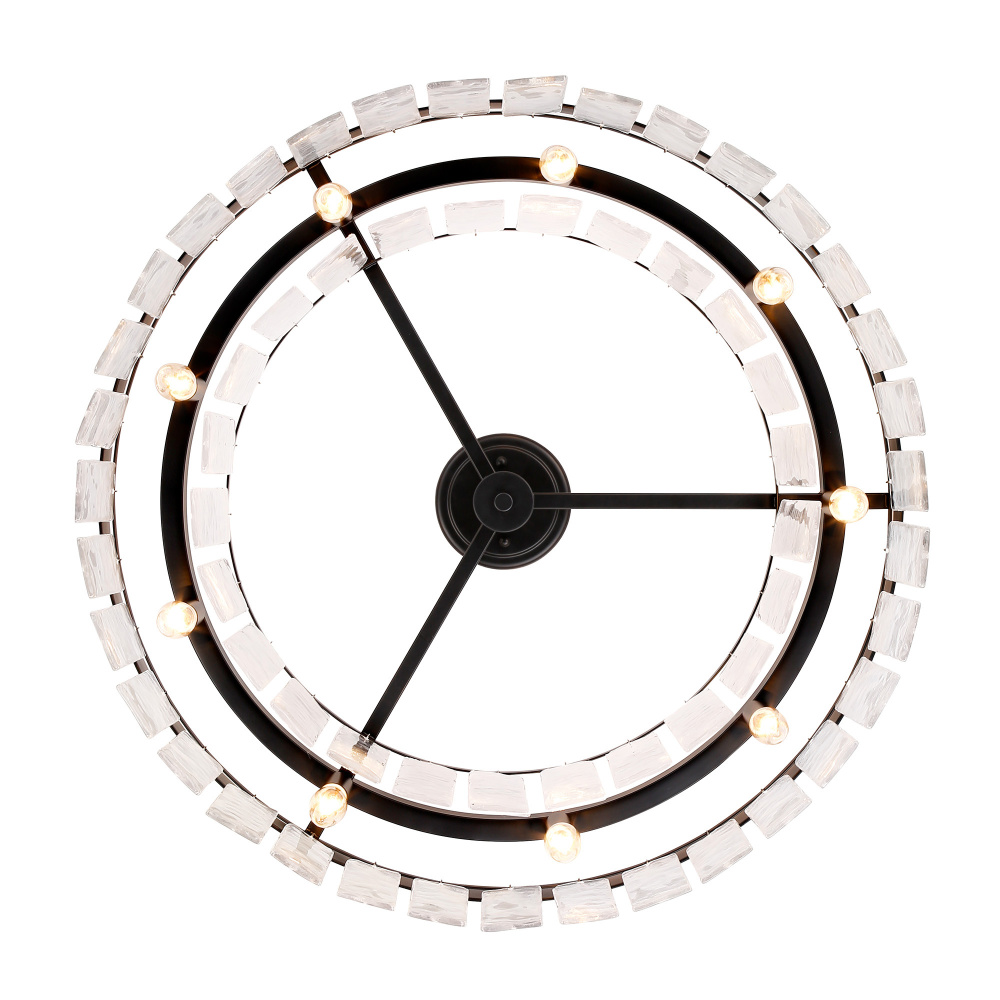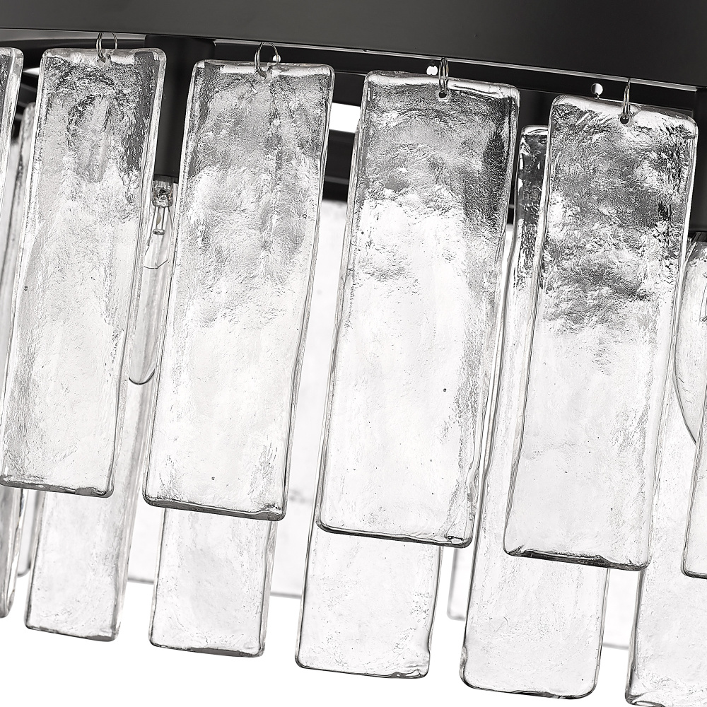 Bring Glam elegance into your home with the Golden Lighting Ciara 9-light Semi-Flush Mount. Featuring a glass shade and a Matte Black frame, it creates a welcoming atmosphere. The hammered water glass shade is crafted to provide a beautifully distorted and refractive light effect, elegantly catching and refracting light to create intricate patterns. This finish, characterized by its timeless and versatile nature, absorbs light and promotes a sophisticated aesthetic. Ideal for areas with mid-height ceilings, this fixture is damp location rated, making it suitable for covered spaces with occasional moisture. With convertible construction, it provides flexible installation options for various ceiling heights. Dimensions measure 27"W x 11"H x 27"D, and it requires 9 E12 Candelabra base bulbs (not included) with a maximum wattage of 60 per bulb. Enhance your interior with this statement piece that combines artistry and quality, promising to impress.
