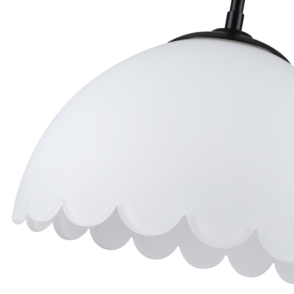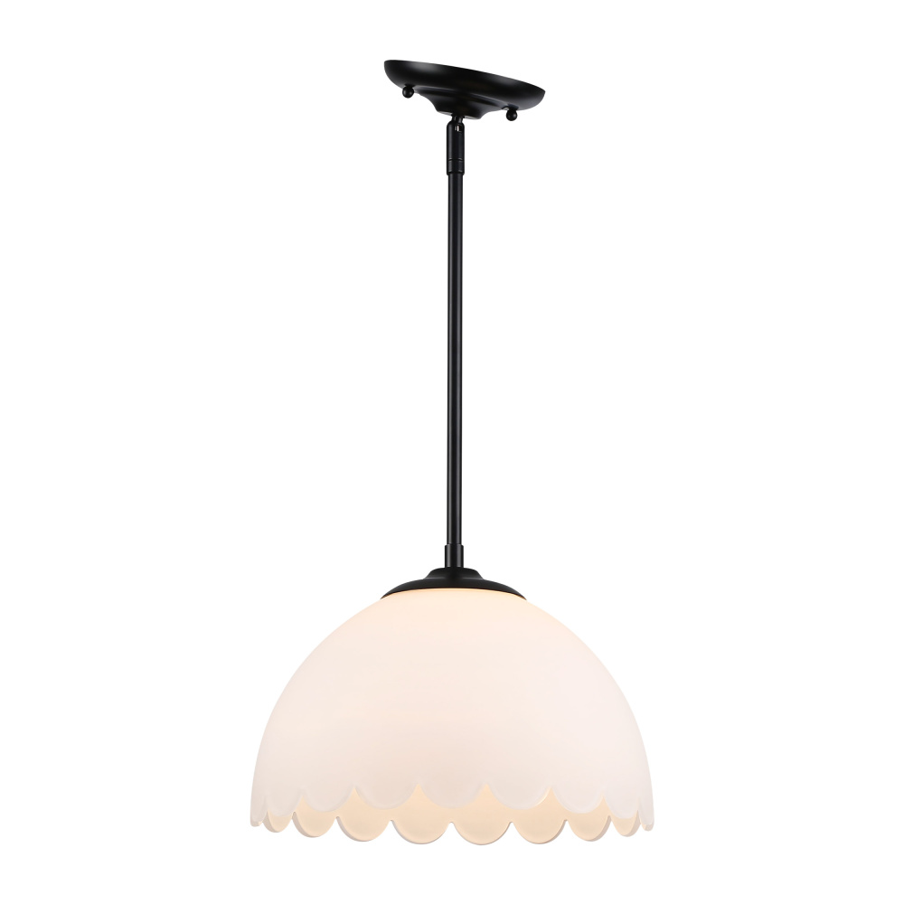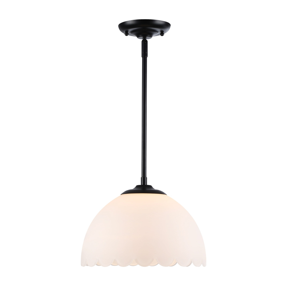 Bring transitional elegance into your home with the Golden Lighting Dorinda 1-light Pendant in Matte Black. Featuring a glass shade and a matte black frame, it creates a welcoming atmosphere. The opal glass shade is designed to diffuse light evenly, providing a soft, glare-free glow that enhances any interior space. Its matte black finish offers a timeless, versatile appeal that complements various decor styles, from minimalist to bold contemporary. Perfect for kitchens, dining rooms, or even entryways, this pendant light is damp location rated, making it suitable for spaces with occasional moisture. Installation is a breeze with its sloped-ceiling compatibility and adjustable height options, allowing you to customize the hanging length from a minimum of 53.875" to a maximum of 8.75". With overall dimensions of 12.25"W x 8.75"H x 12.25"D and requiring one E26 medium base bulb (not included, max 100 wattage), this pendant light is as functional as it is stylish. Illuminate your home with quality and sophistication.