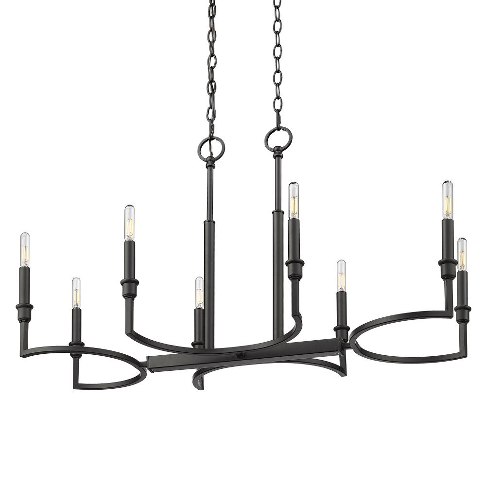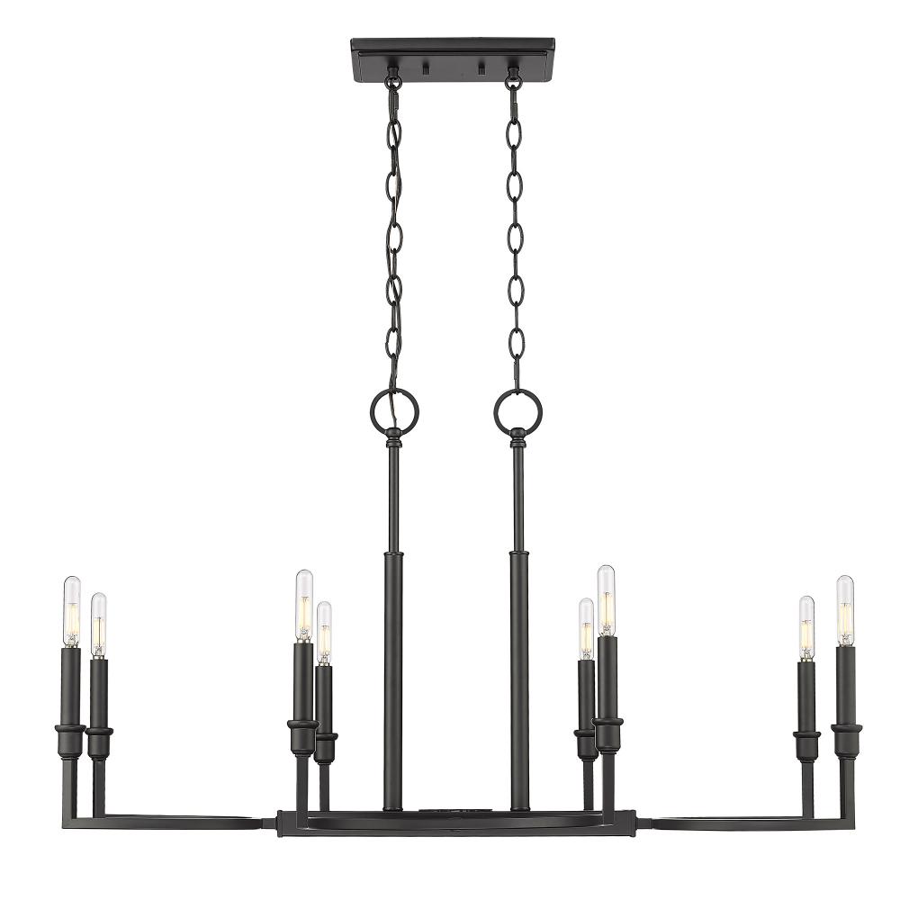 Bring modern elegance into your home with the Golden Lighting Ellyn 8-light Island Light. Featuring a sleek Matte Black finish, it creates a welcoming atmosphere ideal for culinary creativity and social gatherings. The clean geometric lines of this fixture enhance its forward-thinking design, making it an attractive centerpiece for your kitchen island. The Matte Black finish is both timeless and versatile, offering a sophisticated look that complements various decor styles, from minimalist to contemporary. Tailored for kitchen islands, this fixture is Dry Location Rated, making it ideal for indoor spaces not subject to moisture. It is sloped-ceiling compatible, and the adjustable height ranges from 24" to 94", allowing for customizable installation. Overall Dimensions: 35.25"W x 21.25"H x 16.5"D. Requires 8 E12 Candelabra base bulbs (not included). Max wattage per bulb is 60 watts. Elevate your kitchen with this stunning centerpiece that emphasizes both utility and style, providing a warm ambiance for any gathering.