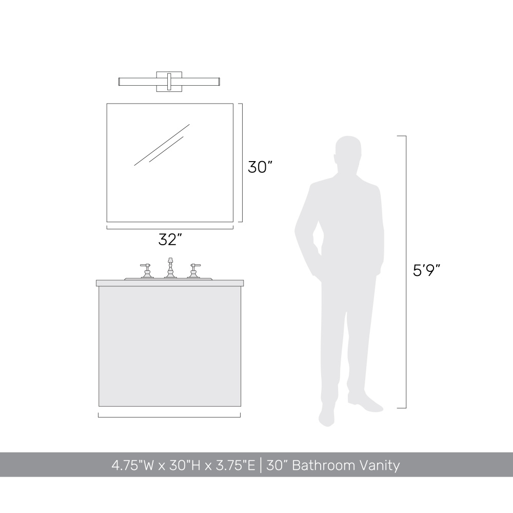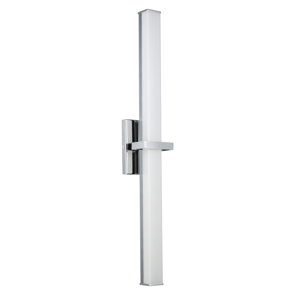 Bring modern elegance into your home with the Golden Lighting Elon Integrated LED 30in Vanity in Chrome. Featuring an acrylic shade and a polished chrome frame, it creates a welcoming atmosphere. \n\nThis acrylic shade features opal glass designed to diffuse light evenly for a soft, glare-free glow. Timeless and elegant, the classic milky white glass provides a beautiful luminosity, perfectly illuminating your space with understated sophistication. \n\nBrilliant and timeless, the polished chrome finish offers a sleek and sophisticated look, seamlessly integrating into various decor styles. It's easy to clean and adds a touch of brightness to your home. \n\nPerfect for brightening up bathrooms, this vanity light is damp location rated, making it suitable for covered areas like bathrooms and laundry rooms. \n\nWith overall dimensions of 30"W x 4.75"H x 3.75"D and utilizing integrated LED technology, you can enjoy brilliant, energy-efficient illumination with a long-lasting, dimmable light source providing 2496.12 rated lumens and a warm glow of 3000K CCT. \n\nEnhance your bathroom with this modern fixture that combines style and functionality, ensuring a beautiful ambiance for your daily routines.