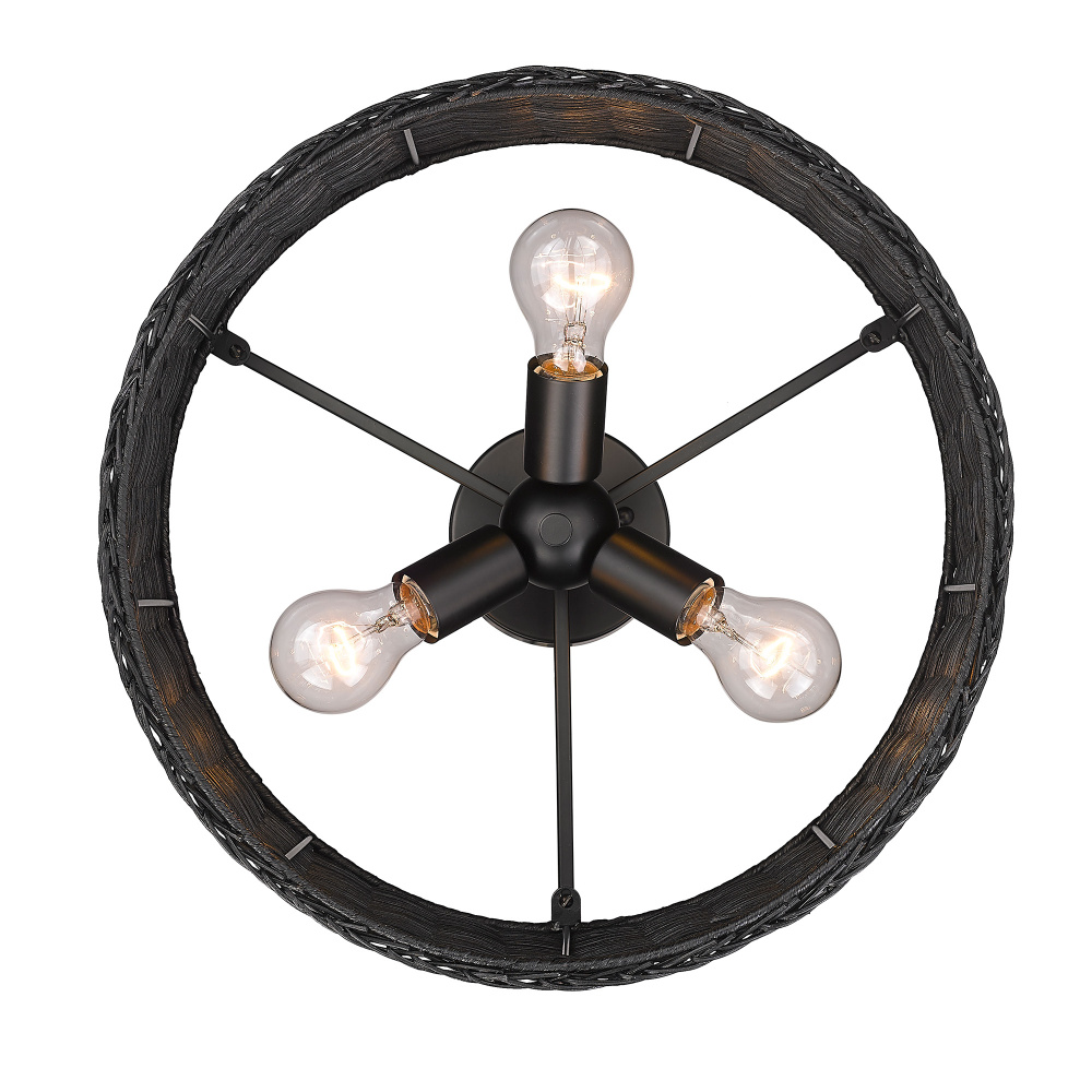 Embrace modern coastal style with the Golden Lighting Erma 3-light Semi-Flush Mount. Featuring a wicker shade and a matte black frame, it creates a welcoming atmosphere. The black wicker shade offers a sophisticated texture, meticulously handcrafted to allow a warm, inviting glow. The matte black finish enhances the contemporary aesthetic with its smooth surface and graphic quality. Ideal for entryways, bedrooms, kitchens, and living areas with mid-height ceilings, this fixture is damp location rated. Requires 3 E26 Medium base bulbs (not included), max 100 watts per bulb. Overall dimensions are 16.38"W x 9.5"H x 16.38"D. Elevate your space with this stylish fixture that beautifully balances elegance and practicality.