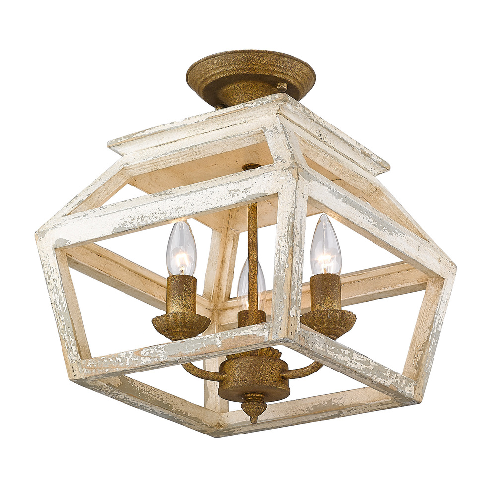 Bring Farmhouse elegance into your home with the Golden Lighting Haiden 3-light Semi-Flush Mount. Featuring a stunning Burnished Chestnut finish frame, it creates a welcoming atmosphere. Crafted from natural wood, the semi-flush mount showcases variations in grain, tone, and texture—celebrating the organic beauty of nature. The Burnished Chestnut finish has a rich and earthy appeal, enhanced by a hand-rubbed burnished effect revealing luminous antique gold highlights. This classic finish brings warmth and timeless tradition to any space. Perfect for entryways, bedrooms, kitchens, and living areas with mid-height ceilings, this fixture is damp location rated—ideal for covered and semi-enclosed spaces. Requires 3 E12 Candelabra base bulbs (not included), max wattage 60 per bulb. Overall dimensions: 12.5"W x 15.25"H x 12.5"D. The Golden Lighting Haiden adds quality and charm, making your space feel truly inviting.