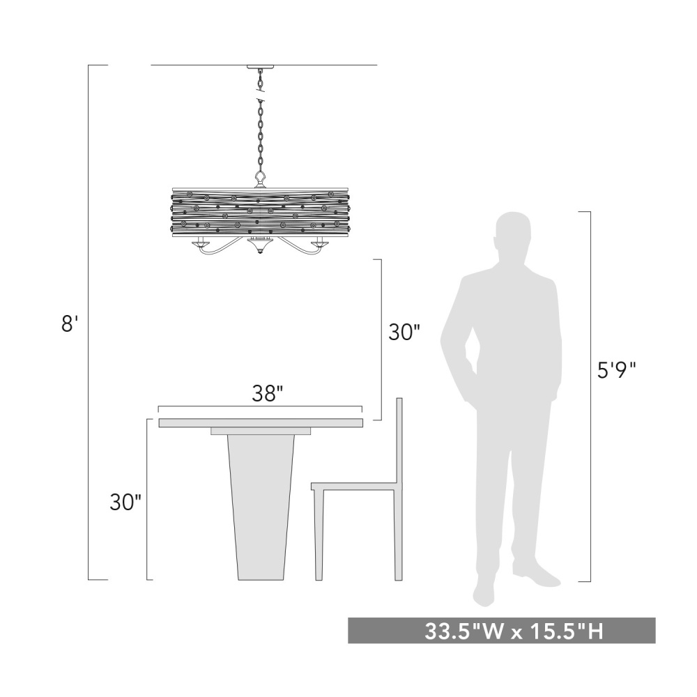 Bring glam elegance into your home with the Golden Lighting Joia 8-light Chandelier in Peruvian Silver. Featuring a fabric shade and a Peruvian Silver frame, it creates a welcoming atmosphere. The Sterling Mist fabric shade presents a sheer light silver hue, designed to diffuse light with a chic, cool glow. This shade captures the luxurious allure of silver, illuminating your space with a soft, metallic luster that enhances elegance. Crafted with inspiration from ancient handmade silver, the Peruvian Silver finish has a muted quality that adds a rustic texture, making it a timeless addition to your decor. Ideal for indoor spaces like dining rooms and living rooms, this chandelier is dry location rated and compatible with sloped ceilings. It has an adjustable height, ranging from 17" to 89". Overall dimensions are 33.5"W x 15.5"H x 33.5"D, and it requires 8 E12 candelabra base bulbs (not included), with a maximum wattage of 60 per bulb. Close your space with the Golden Lighting quality that combines functionality and upscale design, perfect for creating an enchanting atmosphere in any home.