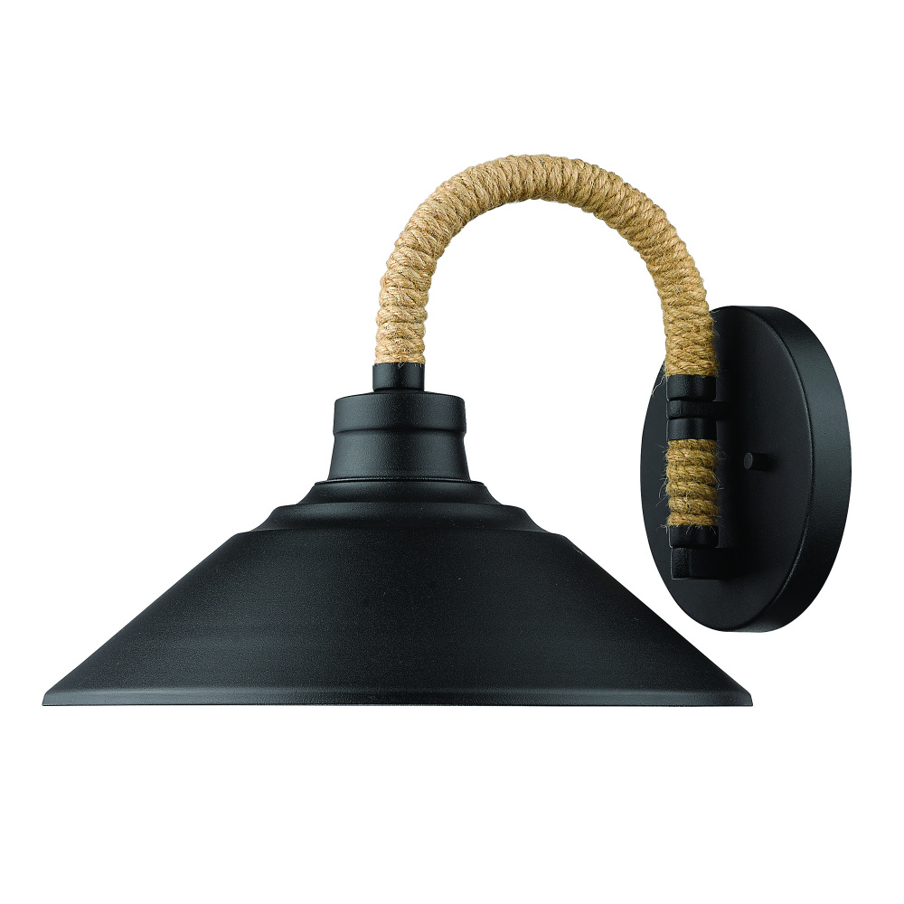 Bring a rustic farmhouse touch into your home with the Golden Lighting Journey 1-light Wall Sconce in Natural Black. Featuring a metal shade and a natural black finish, this sconce creates an inviting ambiance. The natural black finish offers a softer, organic take on classic styles, with a tactile, grounded feel that complements a variety of decor from industrial to transitional. The sconce is adorned with hand-wrapped natural rope accents, providing a distinctly nautical and textural element that captures the relaxed feel of a seaside getaway. Enhance hallways, stairways, and bathrooms, or create a cozy atmosphere in bedrooms and dining areas with this damp location rated fixture, suitable for spaces with occasional moisture. Overall dimensions are 12"W x 9.75"H x 13.38"D, and it requires 1 E26 Medium base bulb (not included), max 100 wattage. Choose the Journey sconce for stylish and functional illumination in your cherished spaces.