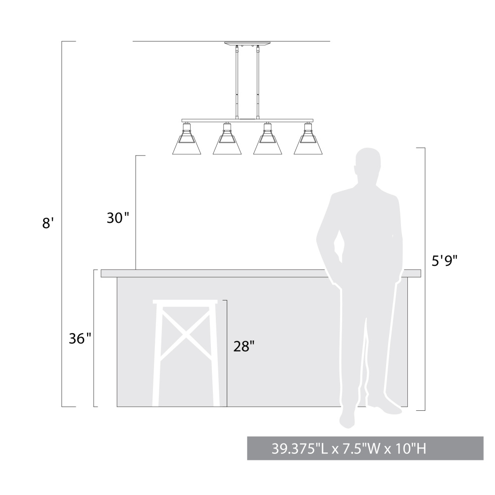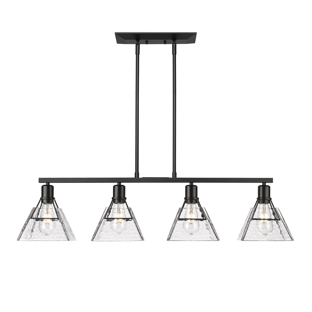 Add a touch of modern elegance to your kitchen with the Golden Lighting Kepler 4-light Island Light. This stunning fixture features a glass shade and a bold matte black frame, creating a captivating statement piece. The water glass shade finds its beauty through its heavy, wavy texture that captures and refracts light, lending a shimmering quality to your space. Our matte black finish is the epitome of timeless modern style, offering a smooth surface that absorbs light to create a soft, sophisticated aesthetic. Tailored for kitchen islands, this fixture is ideal for dry locations and perfect for illuminating spaces with style. Overall Dimensions: 39.38"W x 10"H x 7.5"D. Requires 4 E26 Medium base bulbs (not included), with a maximum wattage of 60. The combination of utility and modern flair is sure to elevate your kitchen decor.