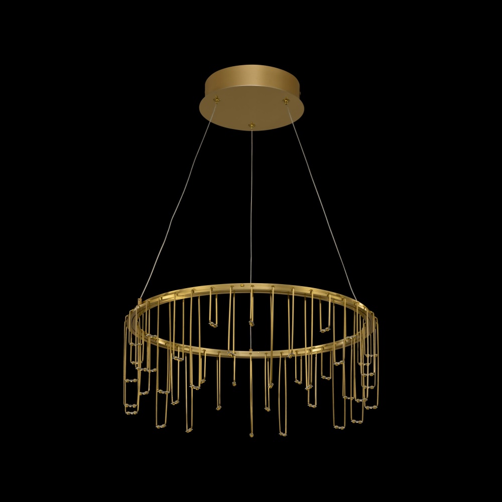 Bring modern elegance into your home with the Golden Lighting Lucerna Integrated LED 14in Chandelier. Featuring a stunning Stainless Steel Gold frame, it creates a welcoming atmosphere. This chandelier, with no shade, presents an avant-garde melting effect crafted from stainless steel that dissolves into delicate prongs, achieving the pinnacle of contemporary design. Experience the quality of the Stainless Steel Gold finish, which is both durable and visually striking, featuring a warm layer of electroplated gold combined with a fine, brushed texture. Ideal for dining rooms, foyers, and other indoor spaces, this fixture is dry location rated and sloped-ceiling compatible, allowing for adjustable height (Min: 9.375", Max: 129.375") to customize your space. Overall Dimensions: 13.75"W x 6.88"H x 13.75"D. Equipped with integrated LED technology, this chandelier provides 1361 lumens of warm illumination at 3000K. Elevate your home with this stylish and durable piece that embodies modern luxury.