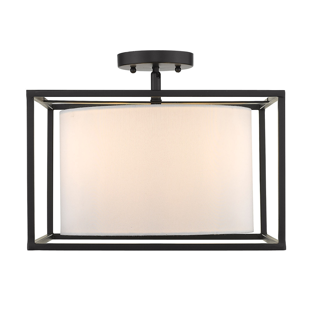Bring Transitional elegance into your home with the Golden Lighting Manhattan 3-light Semi-Flush Mount in Matte Black. Featuring a fabric shade and a matte black frame, it creates a warm atmosphere. The modern white fabric shade offers a clean, tailored look. Crafted from high-quality material, it ensures a soft, diffused, and glare-free glow when illuminated. The matte black finish is timeless and versatile, perfectly smooth to the touch, complementing various decor styles from minimalist to bold contemporary. Ideal for entryways, bedrooms, kitchens, and living areas with mid-height ceilings, this fixture is damp location rated, suitable for covered and semi-enclosed spaces with occasional moisture. It is also sloped ceiling compatible, allowing safe installation on angled or vaulted ceilings. Overall dimensions measure 14.5"W x 11.63"H x 14.5"D, and it requires three E12 candelabra base bulbs (not included), with a maximum wattage of 60 per bulb. Experience the perfect blend of style and practicality with Golden Lighting's commitment to quality and elegance.