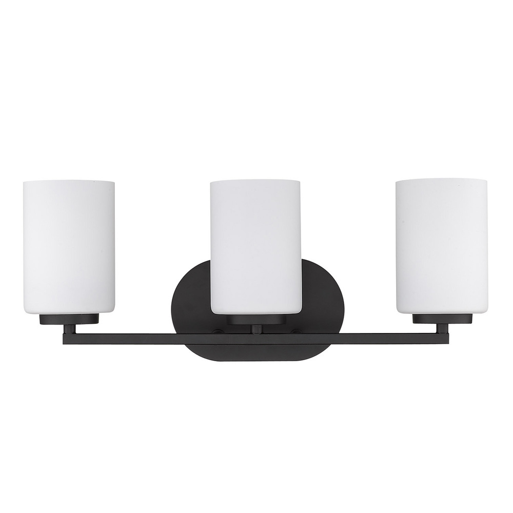 Bring transitional elegance into your home with the Golden Lighting Manhattan 3-light Vanity in Matte Black. Featuring an opal glass shade and a matte black frame, it creates a welcoming atmosphere. The opal glass shade provides a milky, translucent white color that diffuses light evenly for a soft, glare-free glow. This timeless and elegant design offers a luminous ambiance, perfect for modern and contemporary spaces. The matte black finish is smooth to the touch, providing a non-reflective surface that absorbs light and enhances the graphic quality, making it a versatile choice for various decors. Ideal for bathrooms, this fixture is damp location rated, suitable for covered and semi-enclosed spaces with occasional moisture, like covered porches or laundry rooms. Requires 3 E26 Medium base bulbs (not included), max 60 wattage per bulb. Overall dimensions are 20"W x 8"H x 5.88"D, and its beautiful design will add quality and charm to your space, making it the perfect addition to any home.