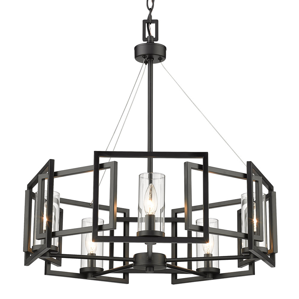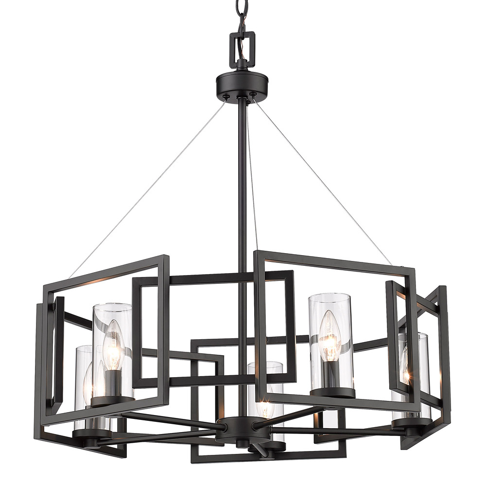 Bring a clean, modern edge into your home with the Golden Lighting Marco 5-light Chandelier in Matte Black. Featuring a glass shade and a matte black frame, it creates a welcoming atmosphere. The clear glass shade offers brilliant, unobstructed light, ensuring the beauty of the bulbs and fixture shines at the forefront. The matte black finish provides a timeless, non-reflective surface that absorbs light, creating understated sophistication and graphic quality. This chandelier is perfect for dining rooms and living spaces, rated for dry locations, making it suitable for indoor areas free from moisture. Easily install it on sloped ceilings, with adjustable height options ranging from 29.625" to 98.5" to fit your space needs. Overall Dimensions: 24.5"W x 25.38"H x 24.5"D. Requires 5 E12 candelabra base bulbs (not included), with a maximum wattage of 60 per bulb. Elevate your home with this stylish chandelier, offering versatility and quality.