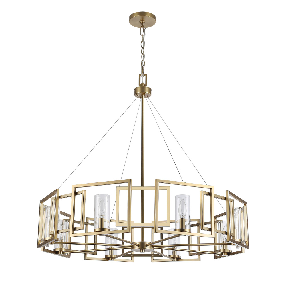 Bring modern elegance into your home with the Golden Lighting Marco 8-light Chandelier. Featuring a glass shade and a brushed champagne brass frame, it creates a welcoming atmosphere. The clear glass shade offers a brilliant, unobstructed light, perfectly complementing the intricate, open-frame geometric design of the chandelier. This timeless glass allows the beauty of the bulb to shine and enhances the fixture's modern appeal. The brushed champagne brass finish is the epitome of sophistication, providing a chic and versatile look that adds a touch of luxury to your space. Ideal for indoor use in dry locations, this fixture is perfect for dining rooms, living spaces, or hallways. It is sloped-ceiling compatible and adjustable in height, allowing for an optimal fit in various room settings. The hanging length can be customized from a minimum of 37" to a maximum of 106". Overall dimensions are 35.38"W x 32.75"H x 35.38"D, and it requires 8 E12 candelabra base bulbs (not included), with a maximum wattage of 60 per bulb. Transform your space with this gorgeous chandelier that delivers bright light and a stunning design, reflecting modern elegance and quality craftsmanship.