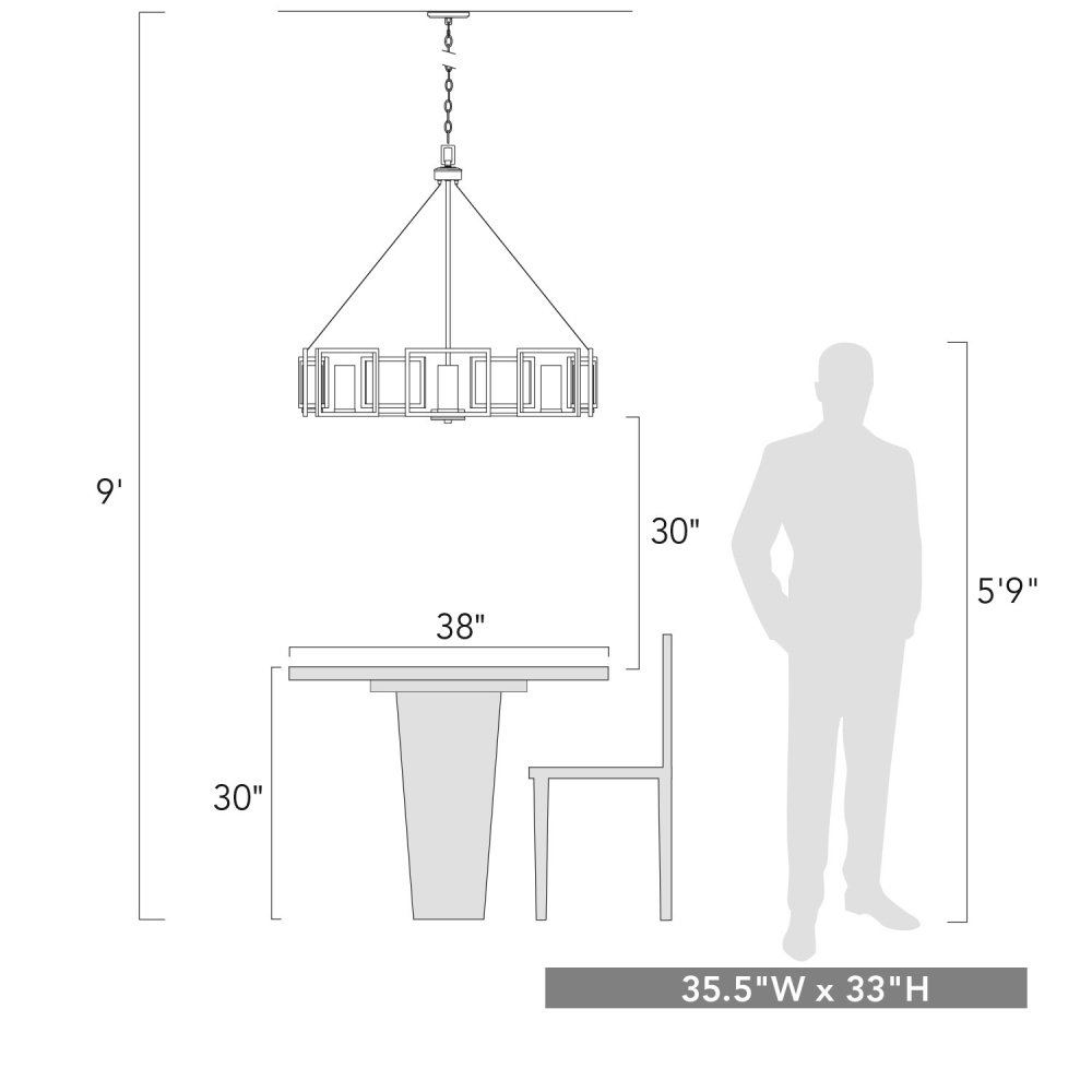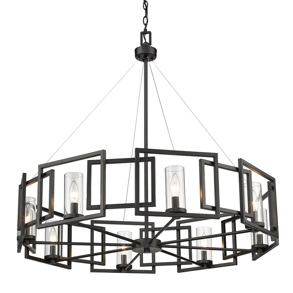Make a bold architectural statement with the Golden Lighting Marco 8-light Chandelier in Matte Black. Featuring a glass shade and a matte black frame, it creates a welcoming atmosphere in any elegant space. The clear glass shade offers brilliant, unobstructed light that showcases the beauty of the bulbs. Its polished and transparent design complements various styles, from modern farmhouse to minimalist. The matte black finish exemplifies clean, modern style, making it a versatile choice for contemporary interiors. It pairs flawlessly with a range of decor, adding a sophisticated touch wherever it's placed. Ideal for dining rooms and foyers, it's dry location rated for indoor spaces not subject to moisture. The chandelier is sloped-ceiling compatible and features an adjustable height ranging from 37" to 106", allowing for customized installation. Overall dimensions are 35.38"W x 32.75"H x 35.38"D, and it requires 8 E12 Candelabra base bulbs (not included), each with a maximum wattage of 60. Revel in the blend of striking design and quality craftsmanship with this stunning fixture.