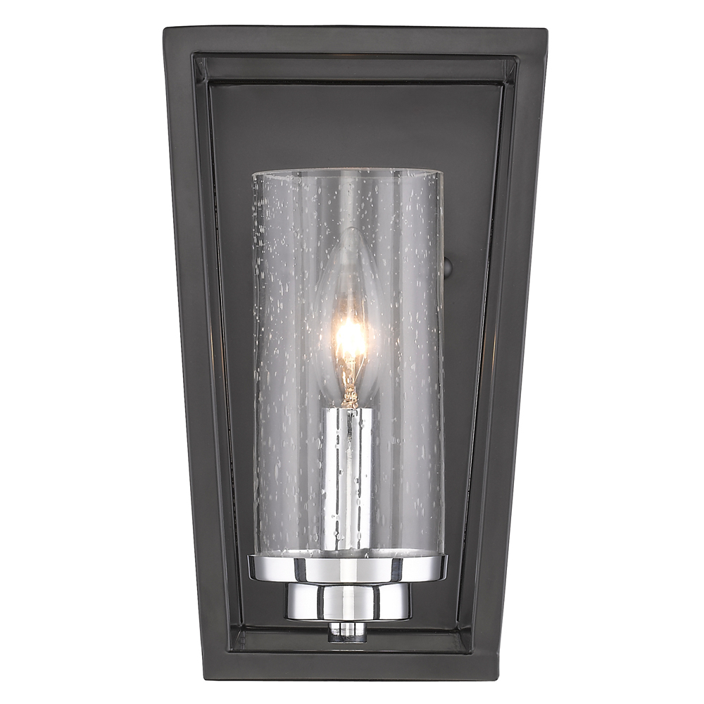 Bring modern elegance into your home with the Golden Lighting Mercer 1-light Wall Sconce. Featuring a glass shade and a Matte Black frame, it creates a cozy ambiance. This seeded glass shade adds a touch of vintage character, reflecting light beautifully with infused air bubbles that create a unique textural look. It gently diffuses the bulb’s glow for a warm, inviting atmosphere. The Matte Black finish is both timeless and versatile, providing a sophisticated look that complements any decor. Its deep color and non-reflective surface offer an understated elegance perfect for minimalist and contemporary aesthetics. Enhance hallways, stairways, or bathrooms with this wall sconce, which is damp location rated, suitable for spaces with occasional moisture. It requires 1 E12 candelabra base bulb (not included, max 60 watt). Dimensions: Overall 6"W x 10"H x 5"D. Illuminate your space with this stylish lighting solution that marries function and form.