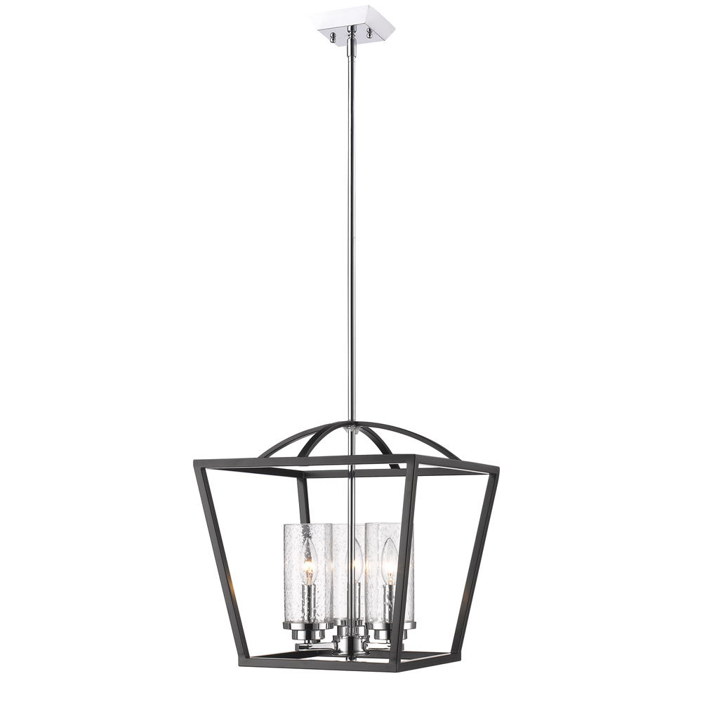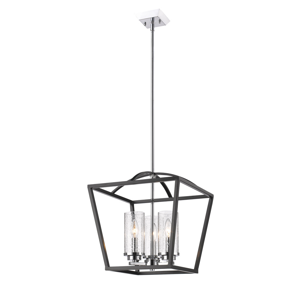 Bring transitional elegance into your home with the Golden Lighting Mercer 3-light Pendant in Matte Black and Chrome Accents. Featuring a glass shade and a matte black frame complemented by chrome details, it creates a welcoming atmosphere. The seeded glass shade, with its unique air bubbles, adds vintage charm while beautifully diffusing light across your spaces. The matte black finish is timeless and versatile, allowing it to blend seamlessly with various decor styles. Ideal for dry locations like bedrooms, living rooms, and hallways, this pendant is easily installed on sloped ceilings with an adjustable height from 18.5" to 60.5". Overall dimensions of 15"W x 15.5"H x 15"D and requires three E12 candelabra base bulbs (60W max) for illumination. Experience a stylish transformation in your space with this exquisite fixture.