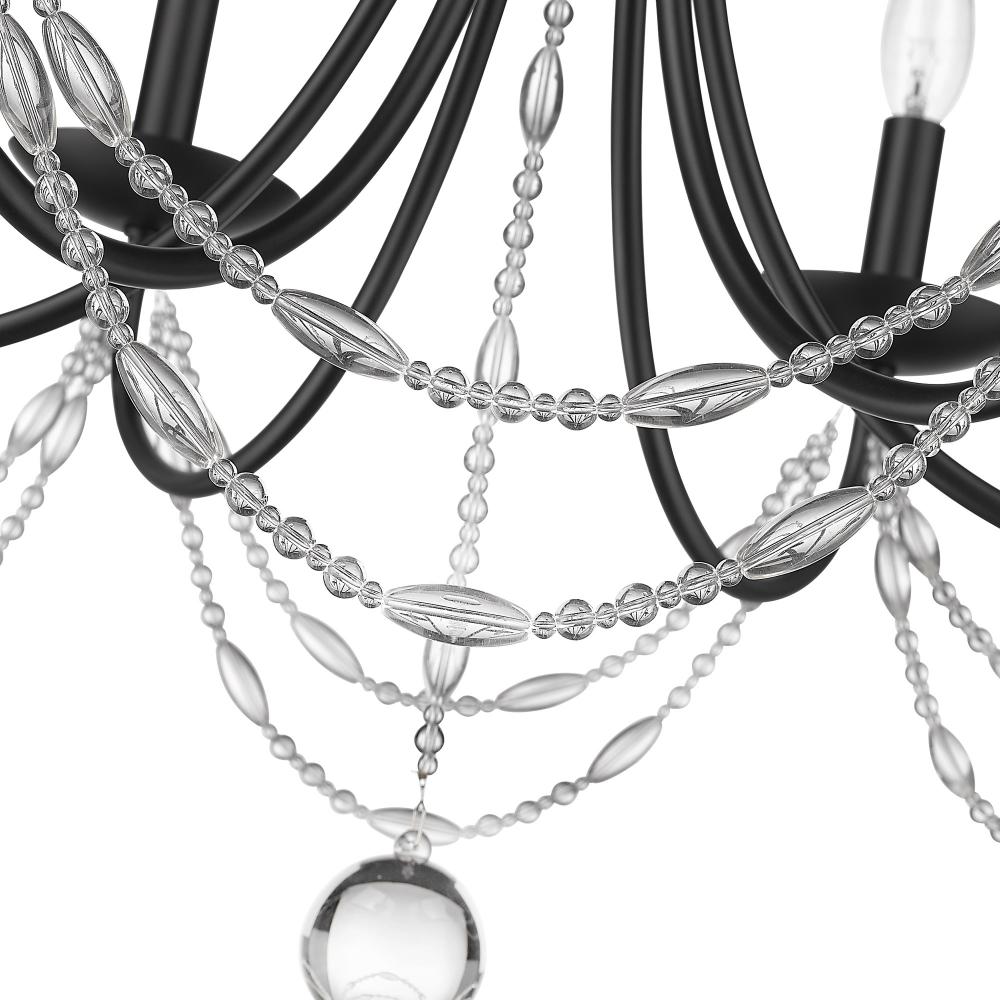 Bring stunning elegance into your home with the Golden Lighting Mirabella 6-light Chandelier in Matte Black. Featuring no shade and a striking matte black frame, it creates a captivating atmosphere in any room. The chandelier is adorned with draped swags of beaded glass, offering a delicate sparkle that captures the heart of the Glam style. The chic matte black finish is versatile, complementing both modern and traditional decor elegantly. Rated for dry locations, it’s ideal for dining rooms, living rooms, and foyers. This fixture is sloped-ceiling compatible and adjustable in height, allowing for customized installation. It requires 6 E12 candelabra base bulbs (not included) with a maximum wattage of 60 per bulb. Overall dimensions are 25"W x 26"H x 25"D. Illuminate your space with sophisticated charm and quality craftsmanship.