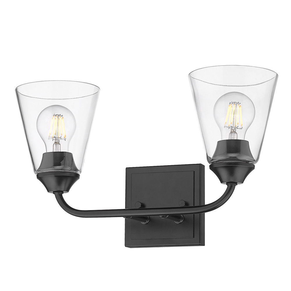 Bring modern sophistication into your home with the Golden Lighting Ormond 2-light Vanity. Featuring Clear Glass shades and a stunning Matte Black frame, it creates a welcoming atmosphere. The Clear Glass shades provide unobstructed light, polished to a high-gloss finish, allowing the brilliance of the bulbs to shine through. This simple yet versatile design makes it perfect for various interior styles from farmhouse to contemporary. The Matte Black finish adds a touch of timeless elegance, with a smooth surface that complements any decor. Damp Location Rated, this light is ideal for spaces with occasional moisture, such as bathrooms and covered porches. Overall Dimensions: 15.75"W x 9"H x 6.63"D. Requires 2 E26 Medium base bulbs (not included, max 60 watt). Stylish and functional, this fixture elevates your bathroom space with its brilliant design.