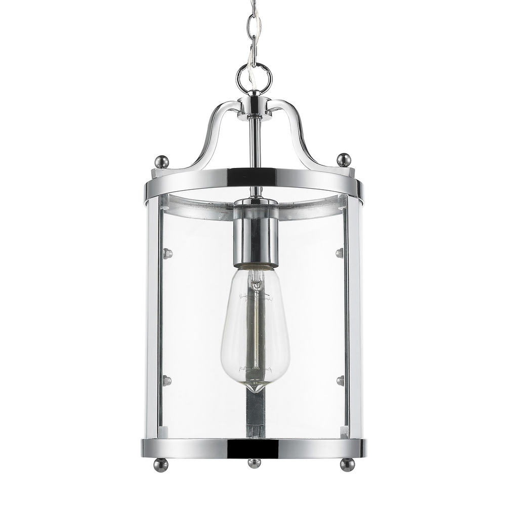 Bring modern elegance into your home with the Golden Lighting Payton 1-light Pendant in Chrome. Featuring a glass shade and a polished chrome frame, it creates a welcoming atmosphere. The clear glass shade offers brilliant, unobstructed light, complementing styles from modern farmhouse to contemporary. The polished chrome finish provides a sleek, reflective surface, adding sophistication to your space. This pendant is damp location rated, suitable for covered areas, making it perfect for entryways, kitchens, and even bathrooms. Sloped-ceiling compatible and adjustable from 15.5" to 87.5" in height, it fits seamlessly into any room. Overall dimensions are 7.25"W x 14.5"H x 7.25"D, requiring 1 E26 medium base bulb (not included), with a maximum wattage of 100. Elevate your home with this stylish and functional fixture, designed to last.