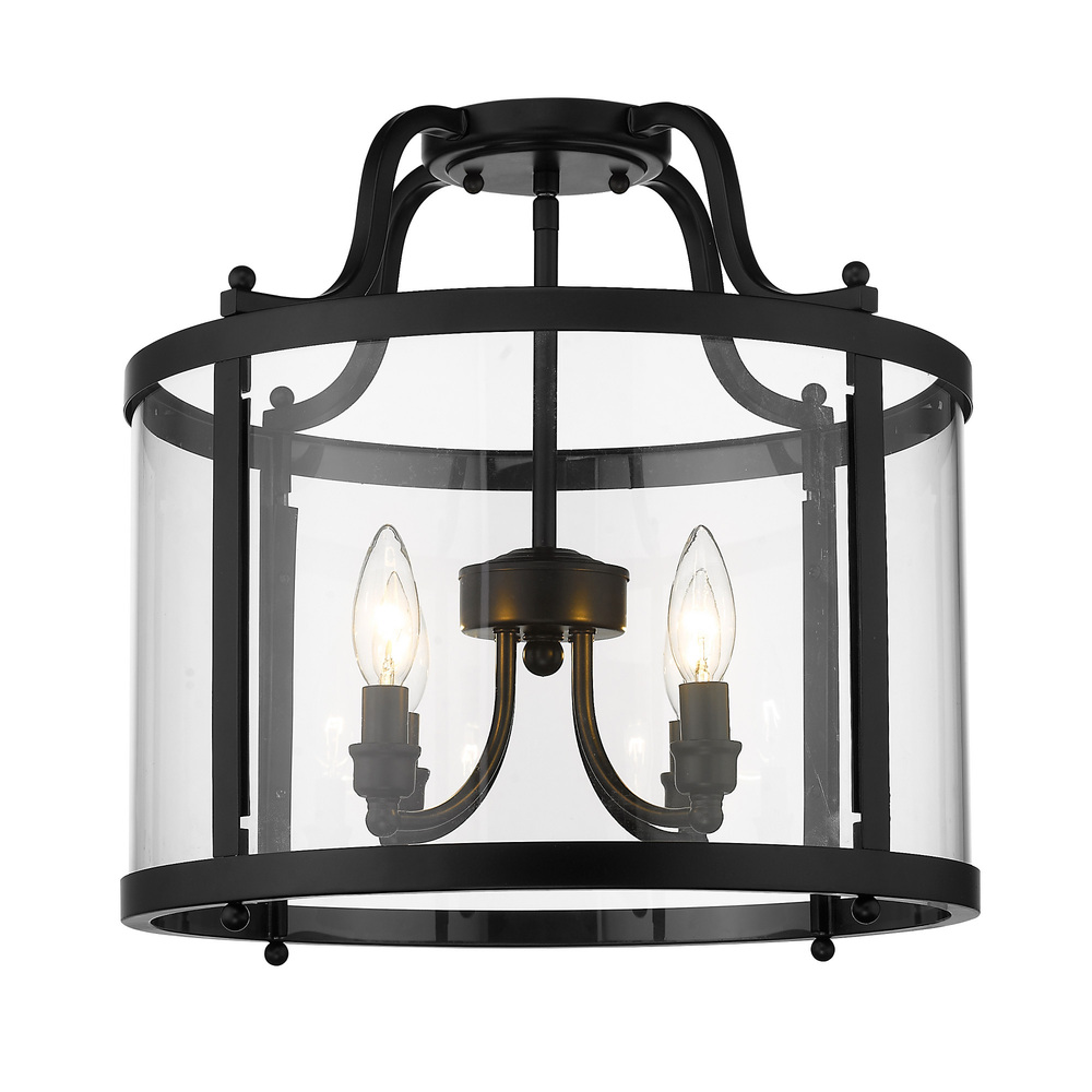 Bring modern sophistication into your home with the Golden Lighting Payton 4-light Semi-Flush Mount in Matte Black. Featuring a glass shade and a matte black frame, it creates an inviting atmosphere. The clear glass shades provide brilliant, unobstructed light, working beautifully in both traditional and contemporary interiors. The matte black finish adds a graphic quality to the design, offering understated elegance for any setting. This fixture is damp location rated, making it suitable for covered and semi-enclosed spaces like entryways, bedrooms, and kitchens. With overall dimensions of 16"W x 15.5"H x 16"D, it accommodates 4 E12 candelabra base bulbs (not included), with a maximum wattage of 60 per bulb. Experience the perfect blend of style and functionality with this elegant semi-flush mount fixture.