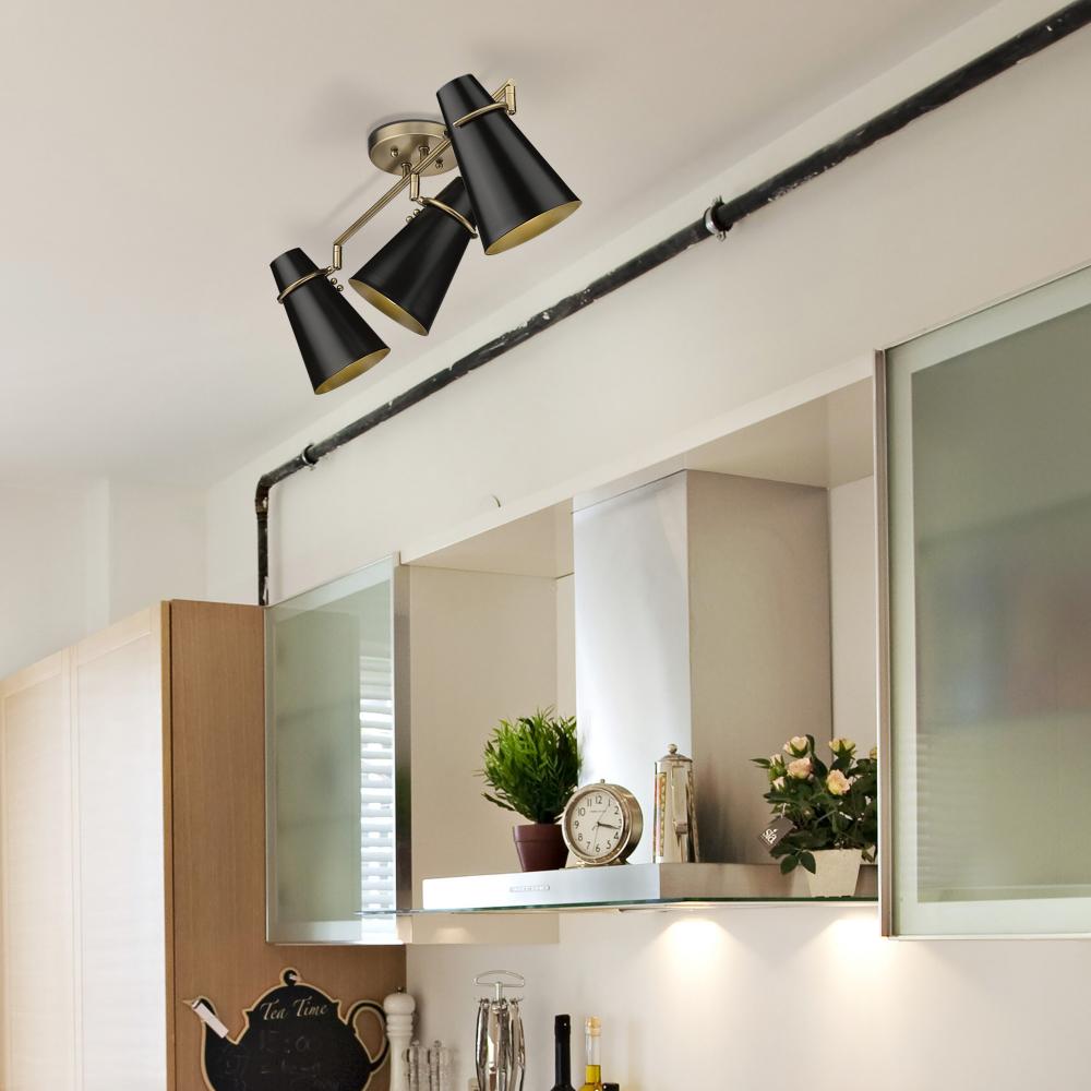 Bring retro-modern elegance into your room with the Golden Lighting Reeva 3-light Semi-Flush Mount. Featuring a Matte Black metal shade and a Modern Brass frame, it creates a bright and inviting atmosphere. The Matte Black shade offers a deep, uniform color with a non-reflective matte sheen, absorbing light and delivering a soft, sophisticated effect. This timeless finish enhances clean, modern designs within your decor. Our Modern Brass finish epitomizes understated elegance—soft, muted, and beautifully diffusing light for a welcoming glow. Ideal for entryways, bedrooms, kitchens, and living areas, this damp location rated fixture works well in covered spaces. The adjustable directional heads allow you to highlight specific areas as needed. Overall dimensions are 29.13"W x 10.75"H x 6.88"D, requiring 3 E26 medium base bulbs (not included) with a maximum wattage of 100 each. Enjoy the blend of style and functionality that this fixture offers, making it a substantial focal point in any room.