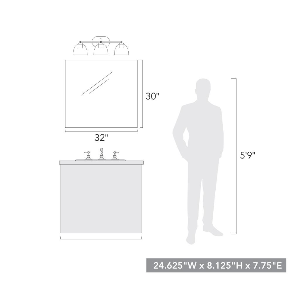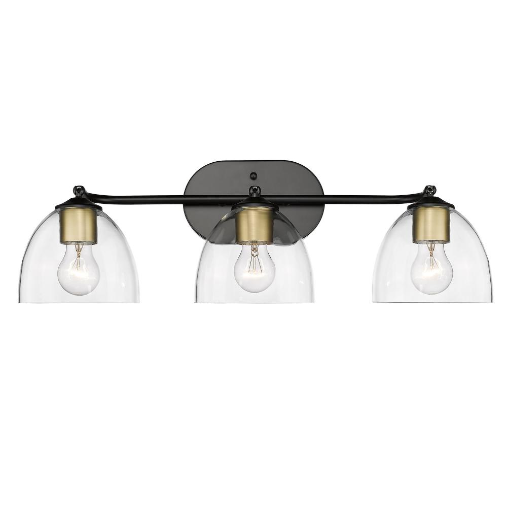 Bring timeless elegance into your bathroom with the Golden Lighting Roxie 3-light Vanity in Matte Black and Brushed Champagne Brass Accents. Featuring a glass shade and a matte black frame, it creates an inviting atmosphere. The clear glass shade provides brilliant, unobstructed light. Polished to a high-gloss shine, the perfectly transparent glass allows the beauty of the bulbs and the fixture's design to take center stage. Its matte black finish is both timeless and versatile, giving a smooth, sophisticated look that complements any decor. With a damp location rating, it's well-suited for bathrooms and other covered spaces prone to humidity. The adjustable directional heads allow you to highlight specific areas with ease. Dimensions: 24.63"W x 8.13"H x 7.75"D. Requires 3 E26 Medium base bulbs (not included) with a maximum wattage of 100 per bulb. Combine style and functionality for a clean, cohesive design that enhances your daily routine.