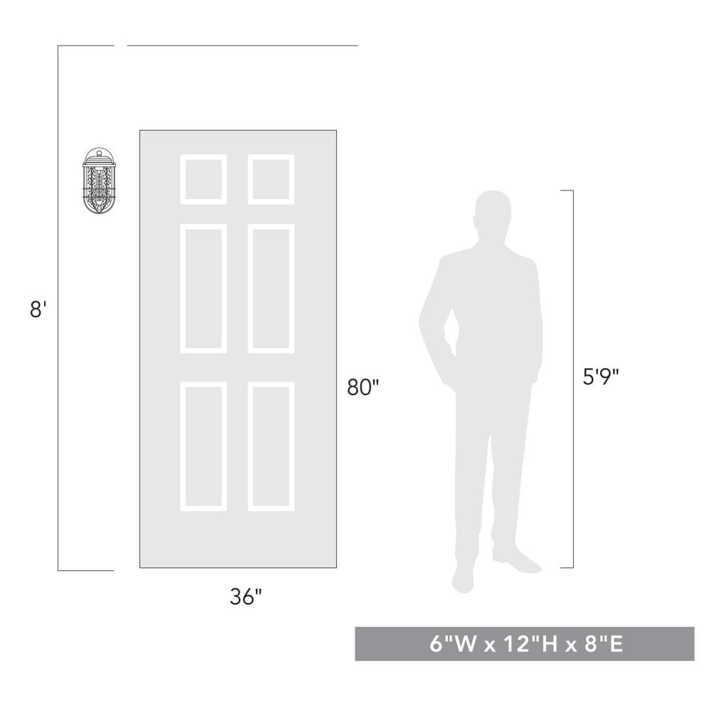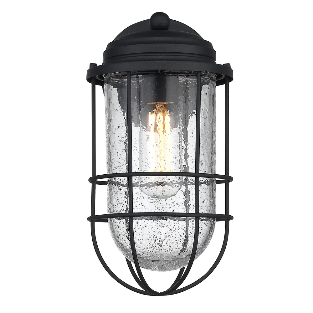 Bring coastal elegance into your home with the Golden Lighting Seaport 1-light 6in Outdoor Wall. Featuring a glass shade and a natural black frame, it creates a welcoming atmosphere. The glass shade is made of seeded glass, characterized by infused air bubbles that create a vintage texture and sparkly light effect when illuminated. Our natural black finish offers a soft, organic take on classic black—reminiscent of raw iron with its chalky, matte surface and fine texture. Functional and inviting at entryways, patios, and garage doors, this fixture is wet location rated to withstand direct exposure to rain and snow. Overall Dimensions: 6"W x 12"H x 8"D. Requires 1 E26 Medium base bulbs (not included), with a maximum wattage of 60. Enhance your outdoor space with this beautifully designed fixture, blending quality and style seamlessly.