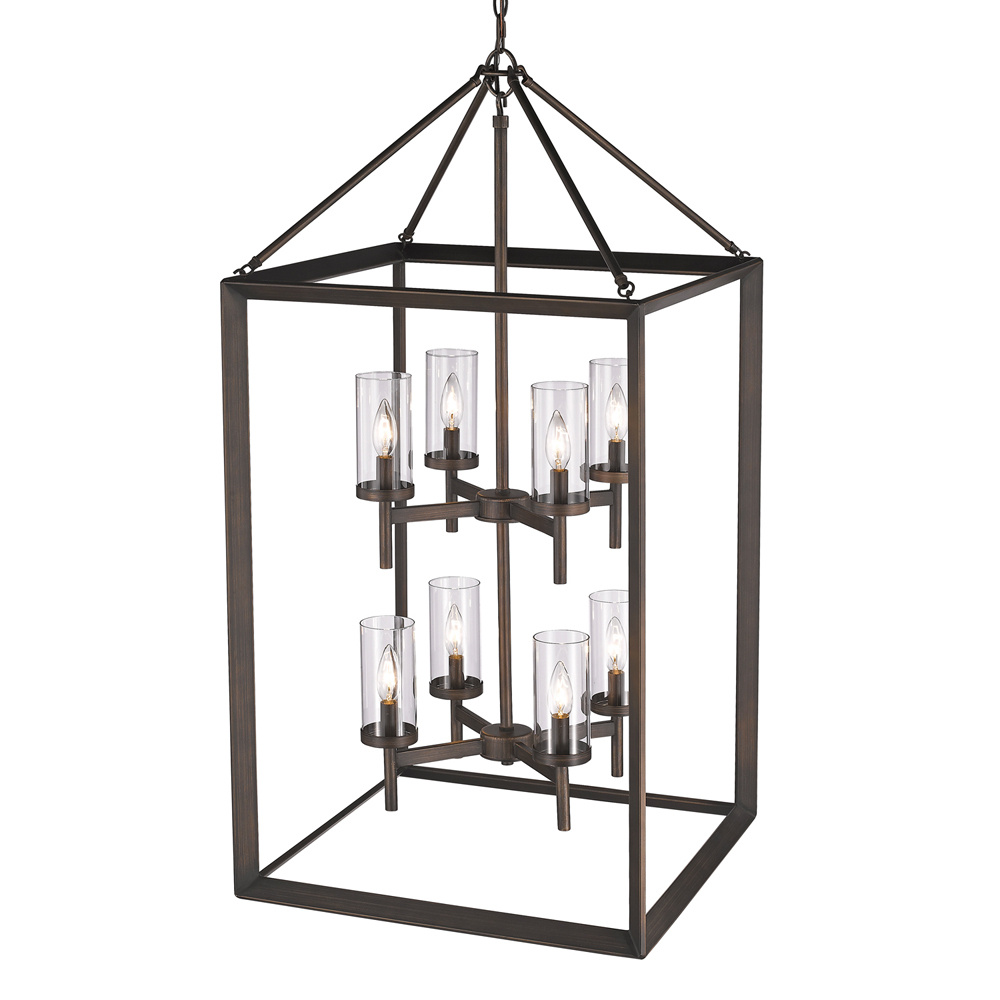 Illuminate your space with a touch of sophistication. Bring Modern elegance into your home with the Golden Lighting Smyth 8-light Pendant. Featuring a glass shade and a Gunmetal Bronze frame, it creates a welcoming atmosphere. The Clear Glass shade provides brilliant, unobstructed light, enhancing the fixture's design while delivering focused illumination. The rich texture of the Gunmetal Bronze finish masterfully blends the warmth of bronze with industrial edge, adding an appealing depth to your decor. Perfect for kitchens, dining rooms, and entryways, this pendant is Dry Location Rated, making it suitable for indoor spaces away from moisture. It’s Sloped-Ceiling Compatible and Adjustable in Height, allowing customization for various ceiling types. Overall Dimensions: 21"W x 42.25"H x 21"D. Requires 8 E12 Candelabra base bulbs (not included), with a maximum wattage of 60 per bulb. Enhance your home with quality craftsmanship and a design that stands out, marrying function with style.