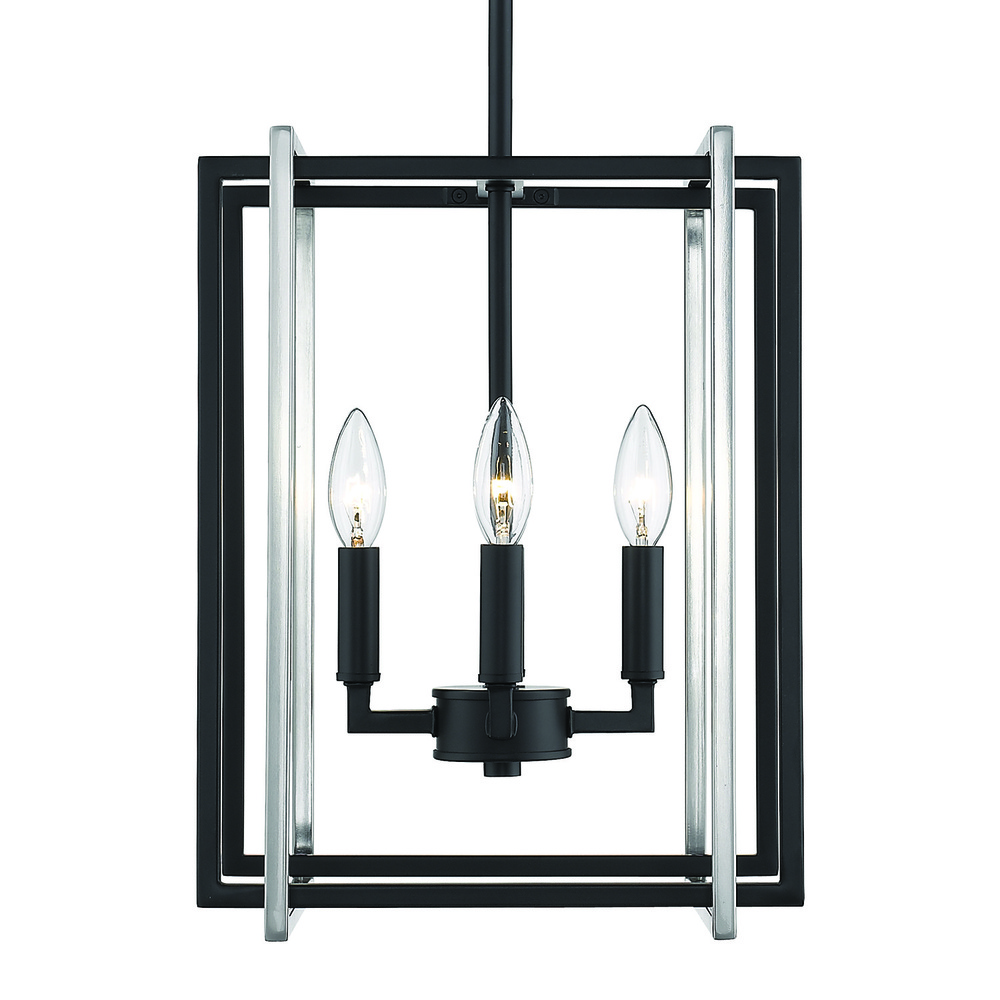 Bring sophisticated style into your home with the Golden Lighting Tribeca 4-light Pendant in Matte Black and Pewter Accents. Featuring a matte black finish and pewter details, it creates a welcoming atmosphere perfect for kitchens, dining rooms, or bedrooms. This pendant combines classic elegance with modern simplicity, showcasing a clean geometric frame that enriches various decor styles. The matte black finish absorbs light, offering a soft glow that enhances your space's ambiance. Dry Location Rated for indoor use, the pendant is easily installed on angled ceilings with an adjustable height feature ranging from 18.875" to 60.875". Overall Dimensions: 12"W x 16"H x 12"D. Requires 4 E12 Candelabra base bulbs (not included), with a maximum wattage of 60 per bulb. Elevate your home lighting solutions with the quality craftsmanship of Golden Lighting, providing a timeless addition to your decor.