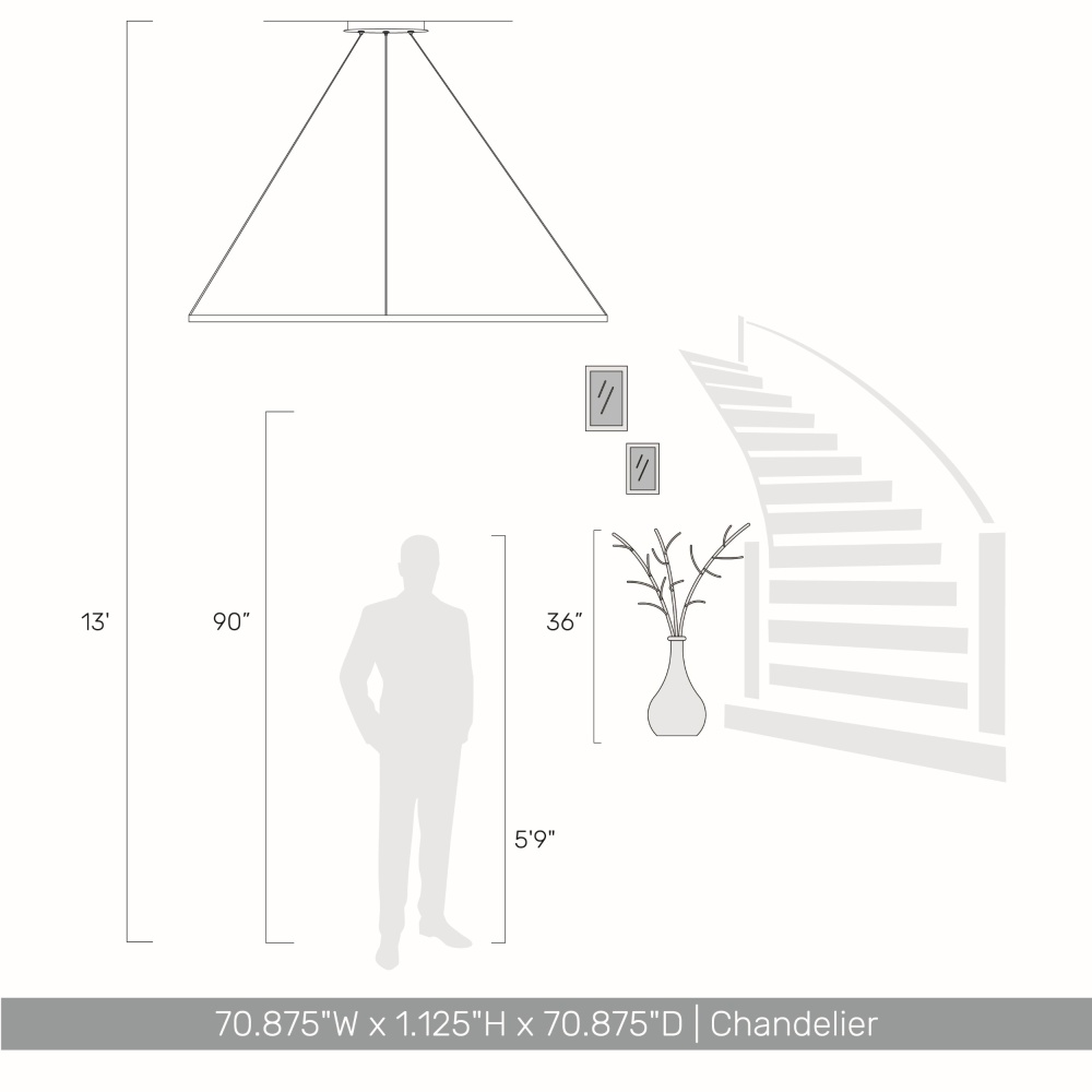 Bring modern elegance into your home with the Golden Lighting Veritas Integrated LED 71in Chandelier in Sand White. This stunning chandelier features innovative integrated LED technology, delivering brilliant illumination while showcasing a sleek, geometric design. The clean, Sand White finish provides a soft and organic aesthetic that absorbs light beautifully, enhancing the overall atmosphere of any space. Ideal for dry locations such as bedrooms, living rooms, and hallways, this chandelier is also sloped-ceiling compatible and has an adjustable height ranging from 30" to 123", ensuring perfect fitting in any room. Overall Dimensions: 70.88"W x 1.13"H x 70.88"D. Integrated LED technology provides 7900 rated lumens and a warm 3000K light glow, making it a captivating centerpiece for your home. With its quality craftsmanship and stylish design, this chandelier is perfect for creating an inviting and contemporary setting.