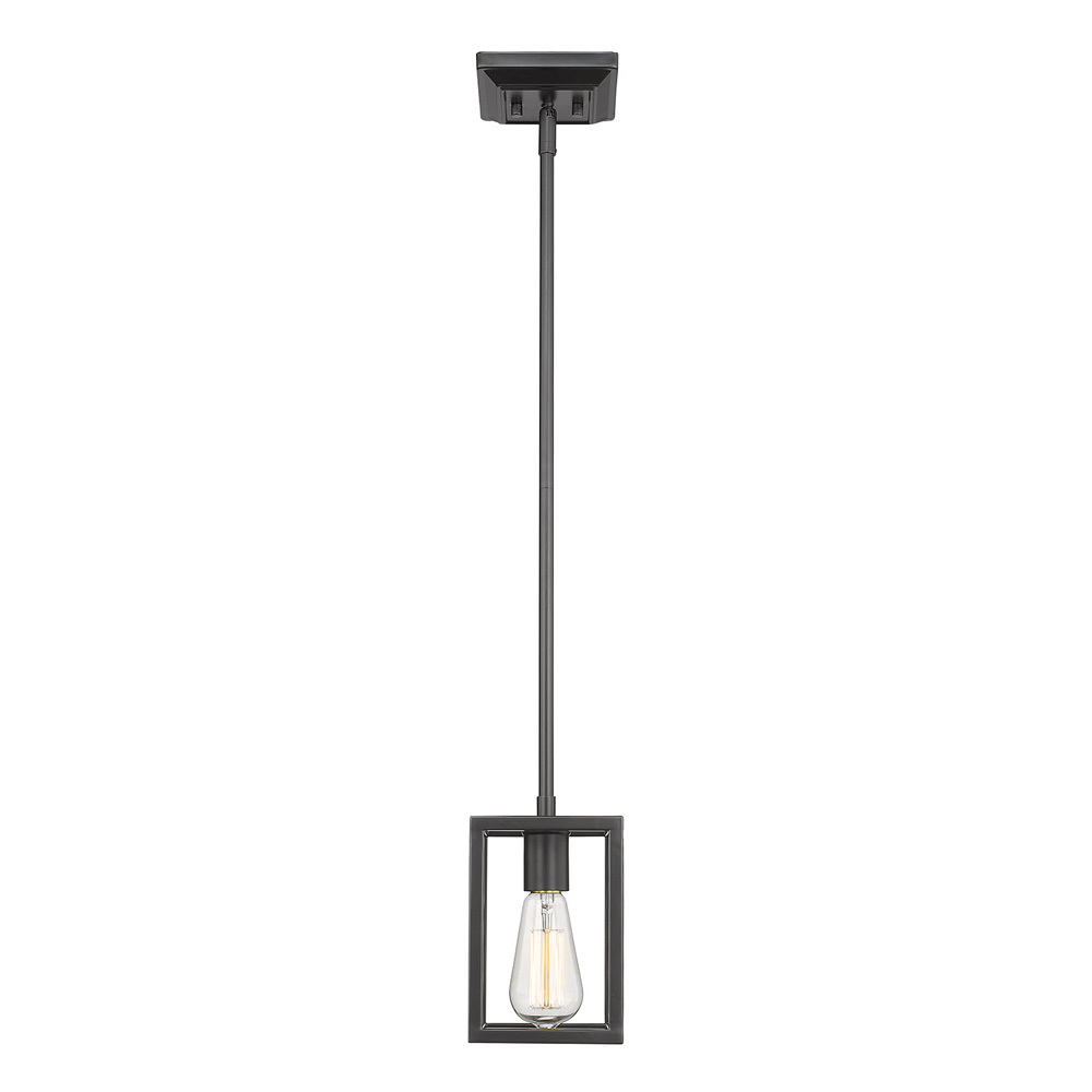 Bring utilitarian elegance into your home with the Golden Lighting Wesson 1-light Pendant. Featuring a Matte Black finish, it creates a welcoming atmosphere. Its cage-like design with a robust frame and exposed bulb embodies the beauty of function and vintage character. The deep black tone adds a sleek touch that complements various decor styles. Perfect for kitchens, dining rooms, and entryways, this fixture is Damp Location Rated, making it suitable for covered spaces with occasional moisture. It features a convertible design for use as a pendant or semi-flush mount, with adjustable height from 11" to 53". Overall dimensions are 5"W x 8.13"H x 5"D, requiring 1 E26 Medium base bulb (not included) at a max wattage of 60. Elevate your style with this striking pendant light.