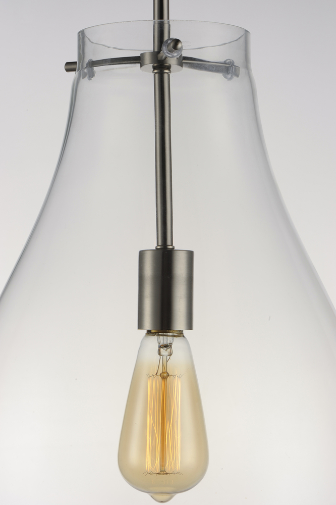 The crystal clear, large-scale glass pendants attest to the craft of hand-blown glass with their impressive scale. These hand crafted glass pendants embody simplicity and minimalism. Accented with Satin Nickel hardware, the style pairs well in a variety of