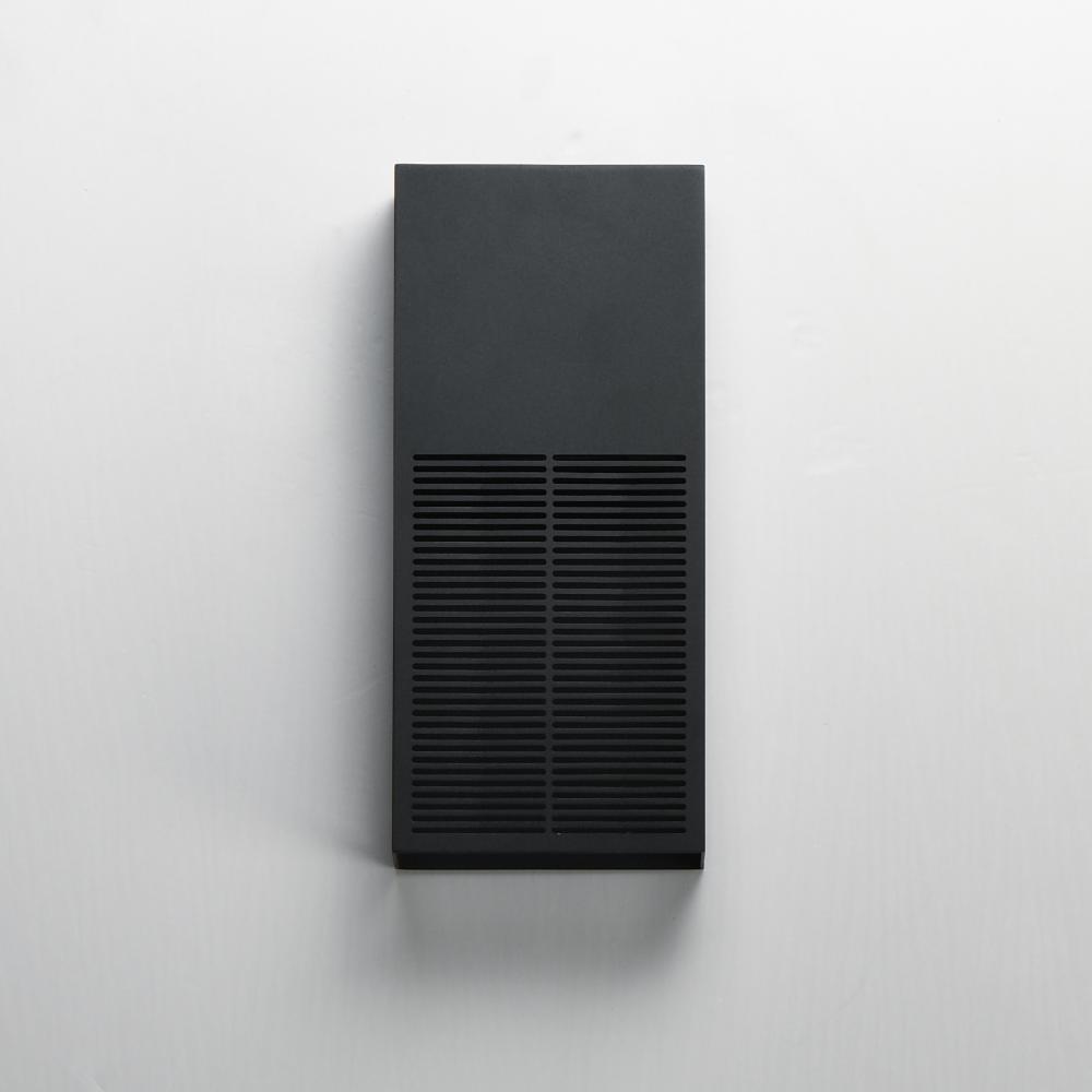 An array of precise slits are stacked in two columns on rectangular shade forms of various sizes. Housed in a blocked out space is a recessed LED light source that casts a filigree that radiate onto the surface surrounding the sconce making a dazzling disp