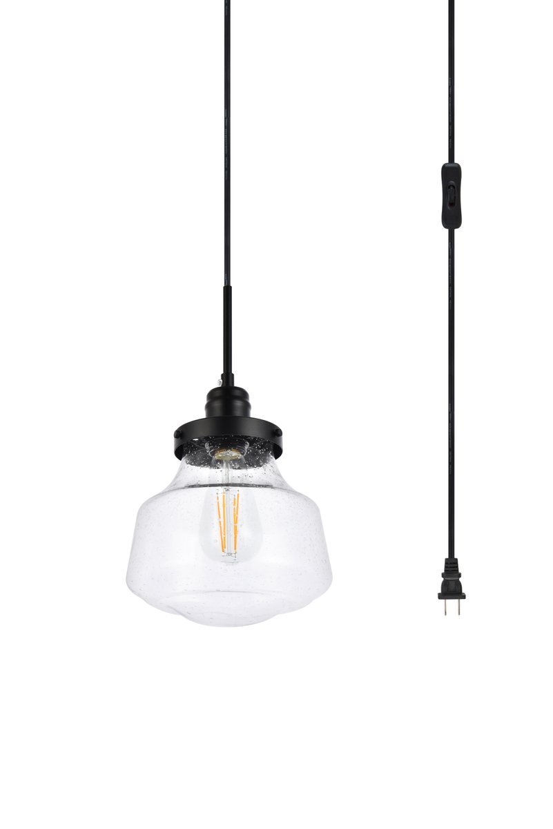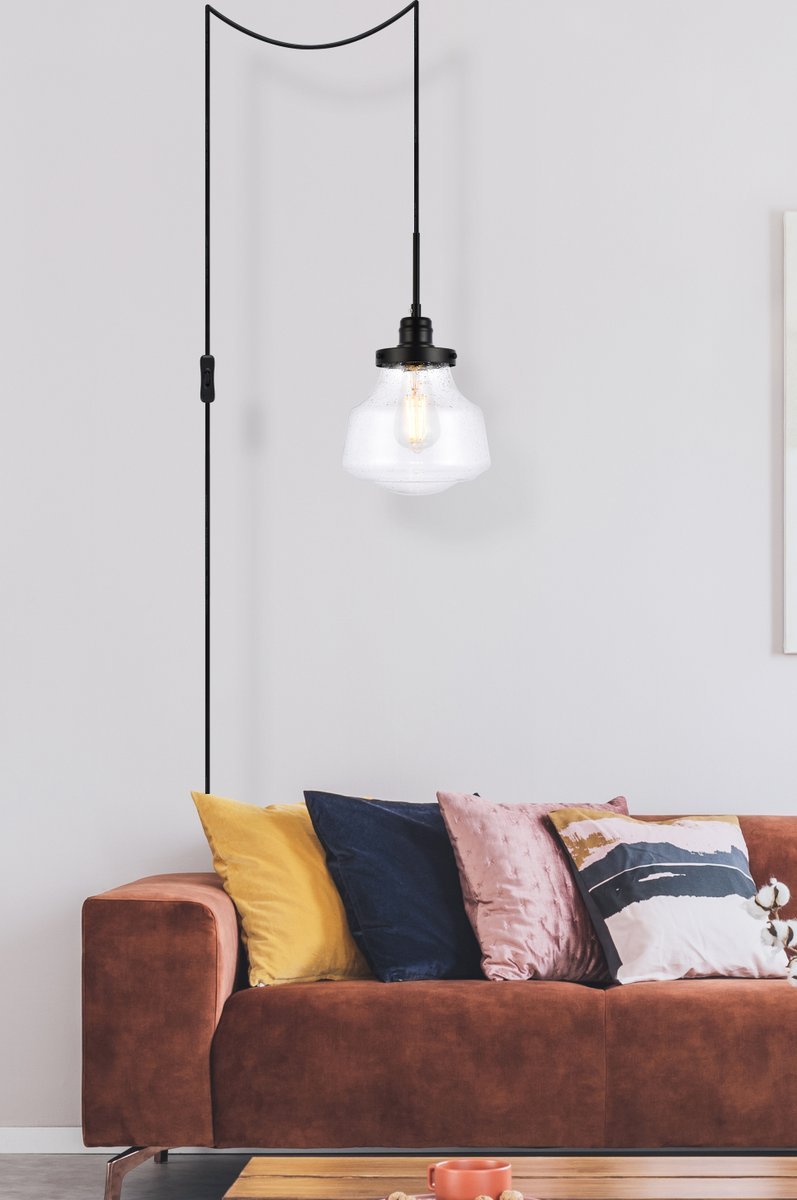 The Lyle Collection is a stunningly functional, yet simplistically lovely light. The geometric shade creates a clean form that will fit well in any space, large or small. Its versatile simplicity allows for this fixture to blend in well with the rest of your room, while still maintaining its own bright personality. Hanging from a 15 foot plug in black cord, it'll always be the perfect height for your dining room table or study space. Available in a black or brass finish, and a clear bubble or frosted white shade, let this pendant lamp illuminate your room (light bulbs not included). Simply hang this piece on the provided swag hooks and plug it in for an effortlessly easy installation - can be hung from a sloped or vaulted ceiling.