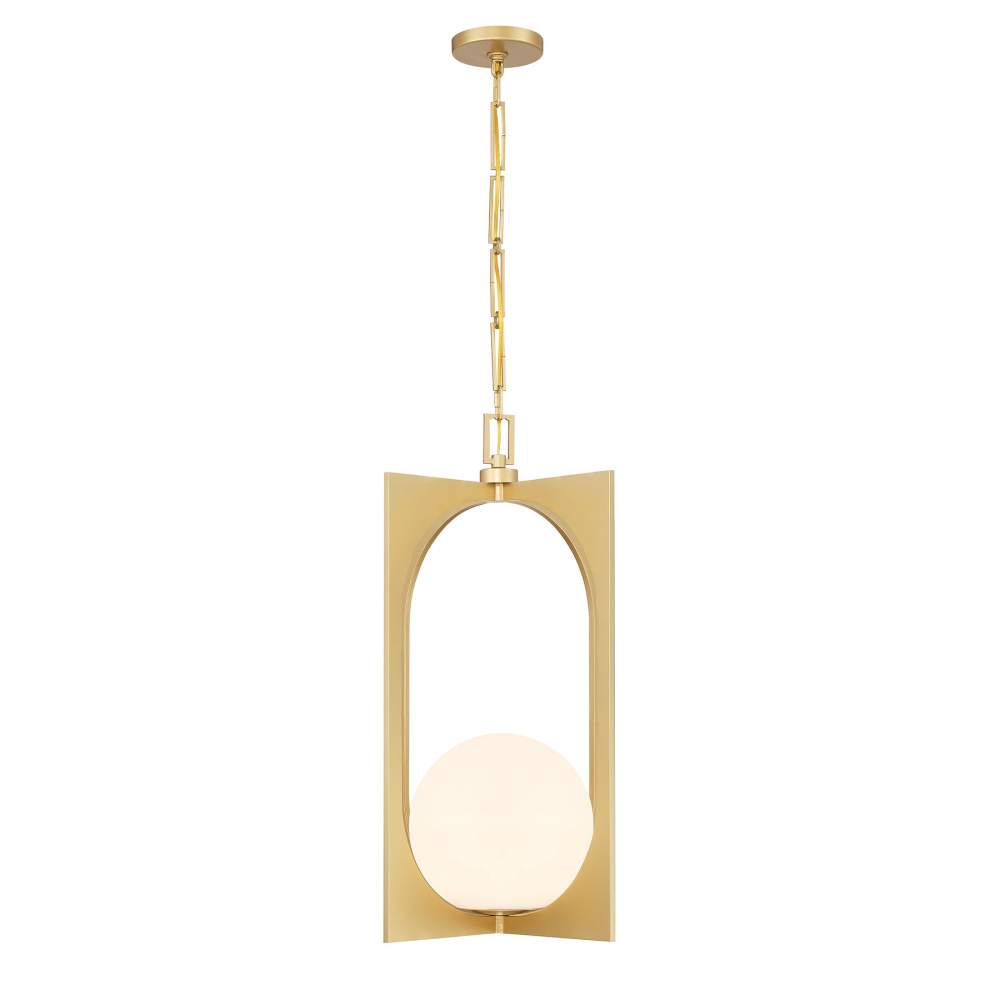 Get geometric elegance like no other when you get the Savoy House Harding 1-light pendant. An orb of opal glass is held within a sleekly structured frame that expertly combines ovals with rectangles. The shape of the frame is reflected in the hanging chain, too! A Spun Gold finish adds shimmer and shine. Harding is 28" in height and 16.5" in width. It uses one standard size bulb of up to 60 watts. Bulb not included. Comes with 120" of chain and 144" of cord.