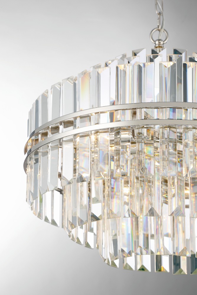 Create a lasting impression with the Hayes collection. This stunning masterpiece features tiered multi-faceted crystals elegantly held by a sleek steel frame. The sophisticated design transforms any space into a captivating focal point. Elevate your surroundings with the Hayes collection's striking beauty and mesmerizing presence.