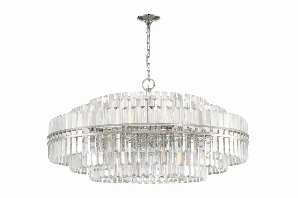 Create a lasting impression with the Hayes collection. This stunning masterpiece features tiered multi-faceted crystals elegantly held by a sleek steel frame. The sophisticated design transforms any space into a captivating focal point. Elevate your surroundings with the Hayes collection's striking beauty and mesmerizing presence.