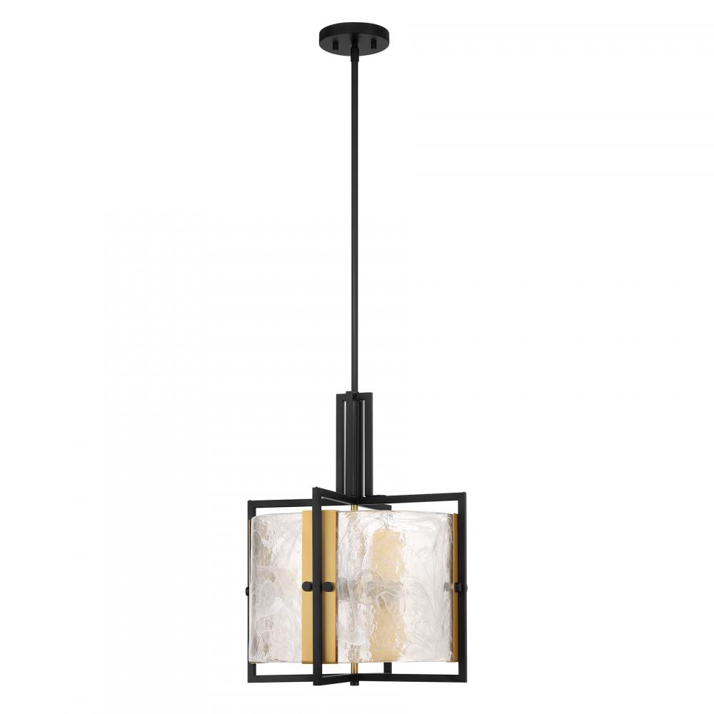 Swirling, mesmerizing strie piastra glass surrounds the lights within the Savoy House Hayward 3-light pendant. The Matte Black frame showcases Warm Brass accents for another dimension of style. Hayward is 16" in width and has an adjustable height ranging from 20" to 74". Comes with four 12" downrods and one 6" downrod. Uses three standard size bulbs of up to 60 watts per bulb. Bulbs are not included.