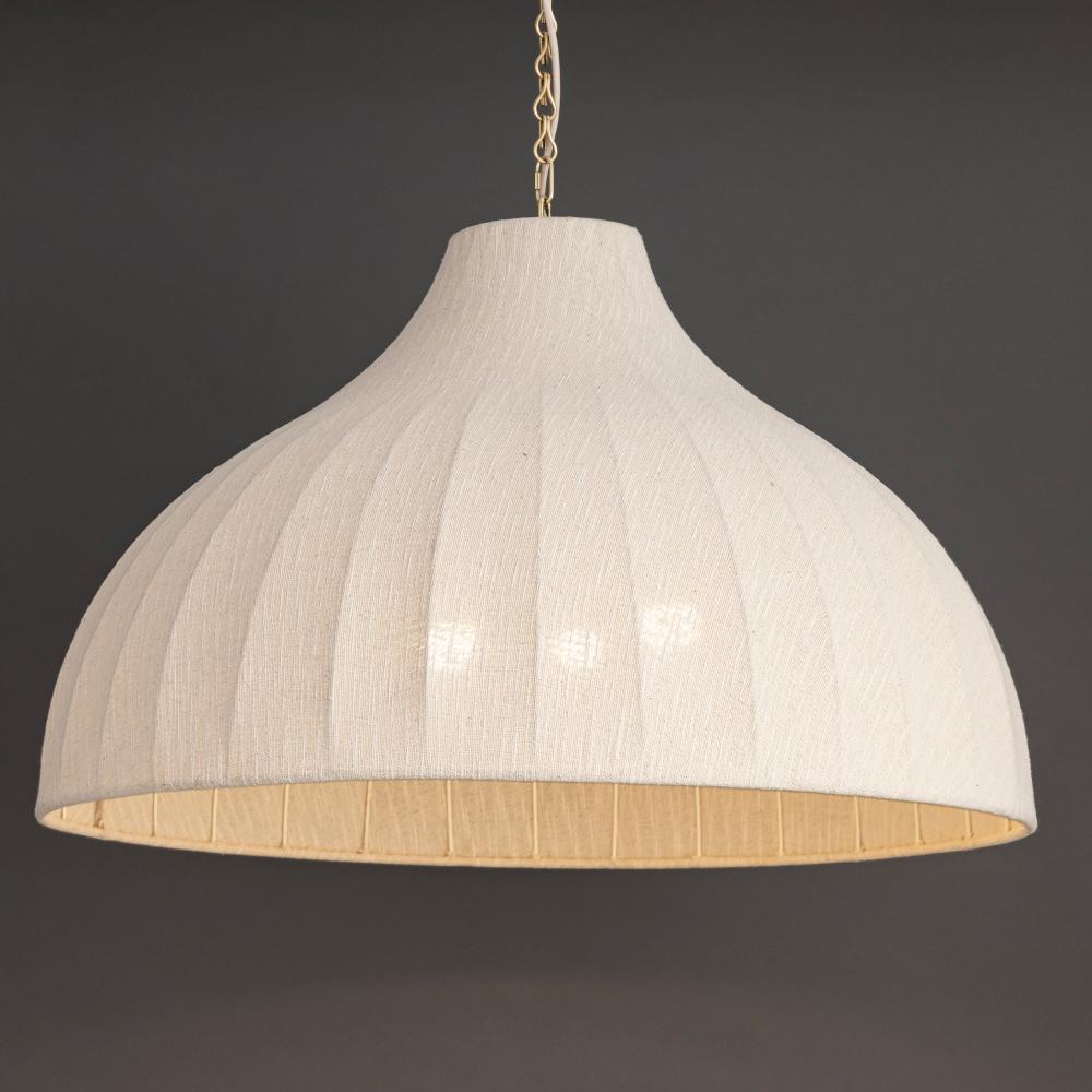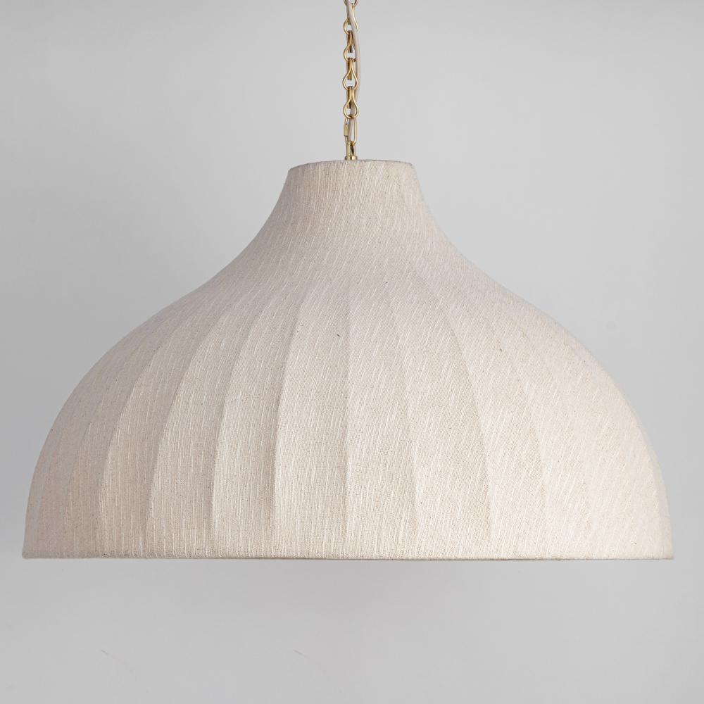 Like a breeze caught in linen, Hearthveil elevates interior spaces with its lightness and rich details. A sheer gossamer fabric is delicately stretched over a bell-shaped metal frame, softly diffusing light while revealing its sculptural ribs. Suspended by