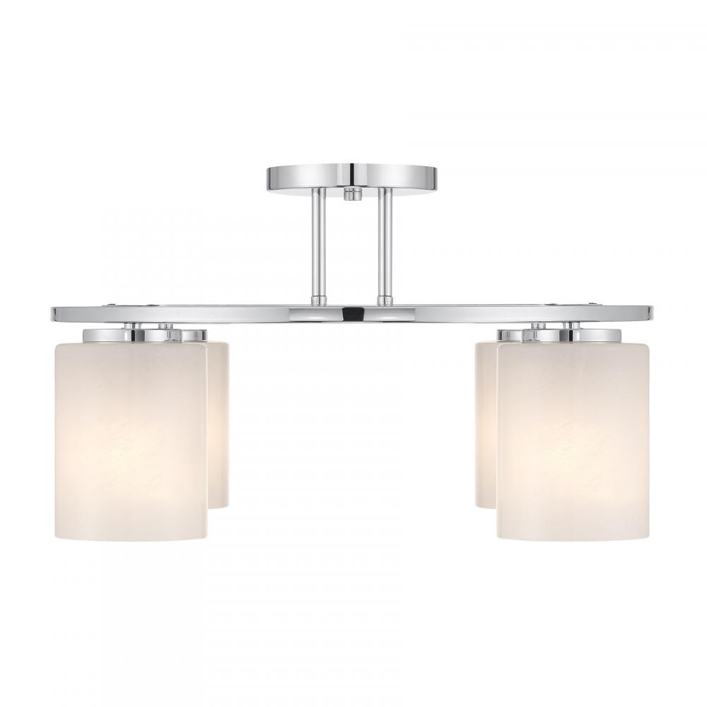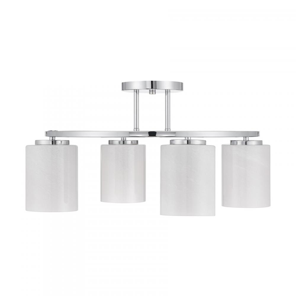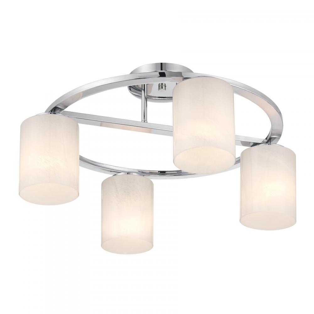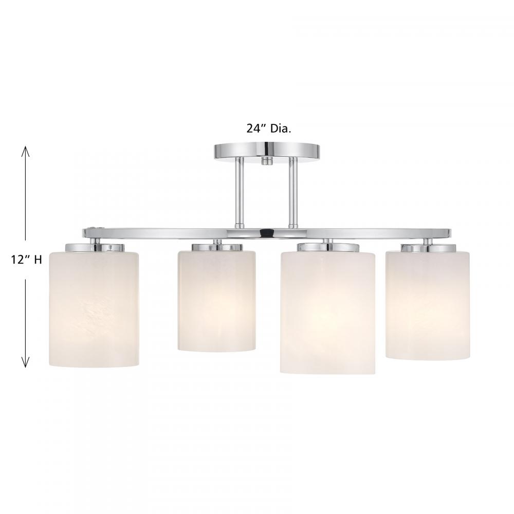 Illuminate any room with the bold modern style of the Savoy House Herron 4-light ceiling semi-flush mount. Its sleek, round structure wears a Chrome finish and is decorated with cylinders of swirling, stunning strie glass. Herron is 12" in height and 24" in width. It uses four standard size bulbs of up to 60 watts per bulb. Bulbs not included.