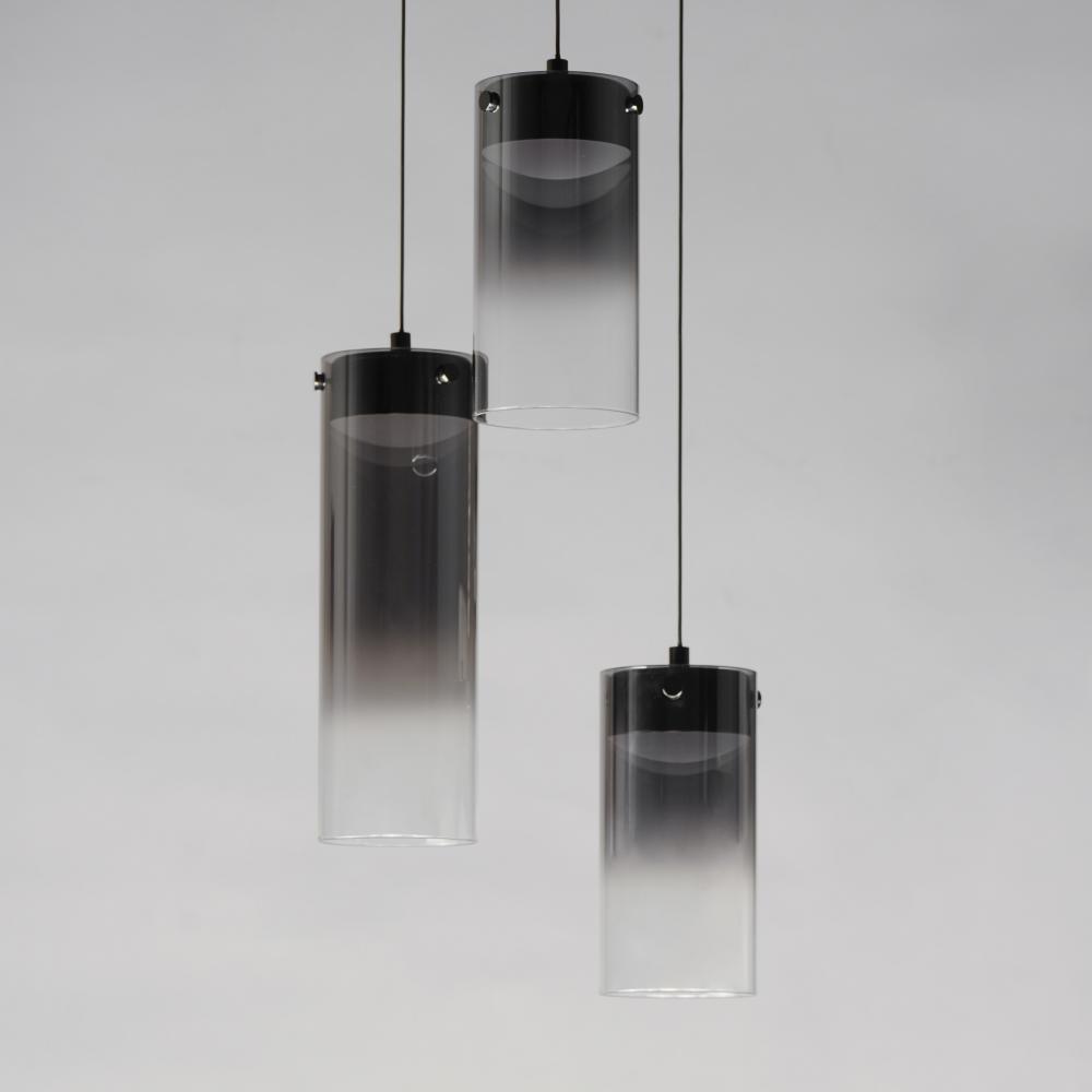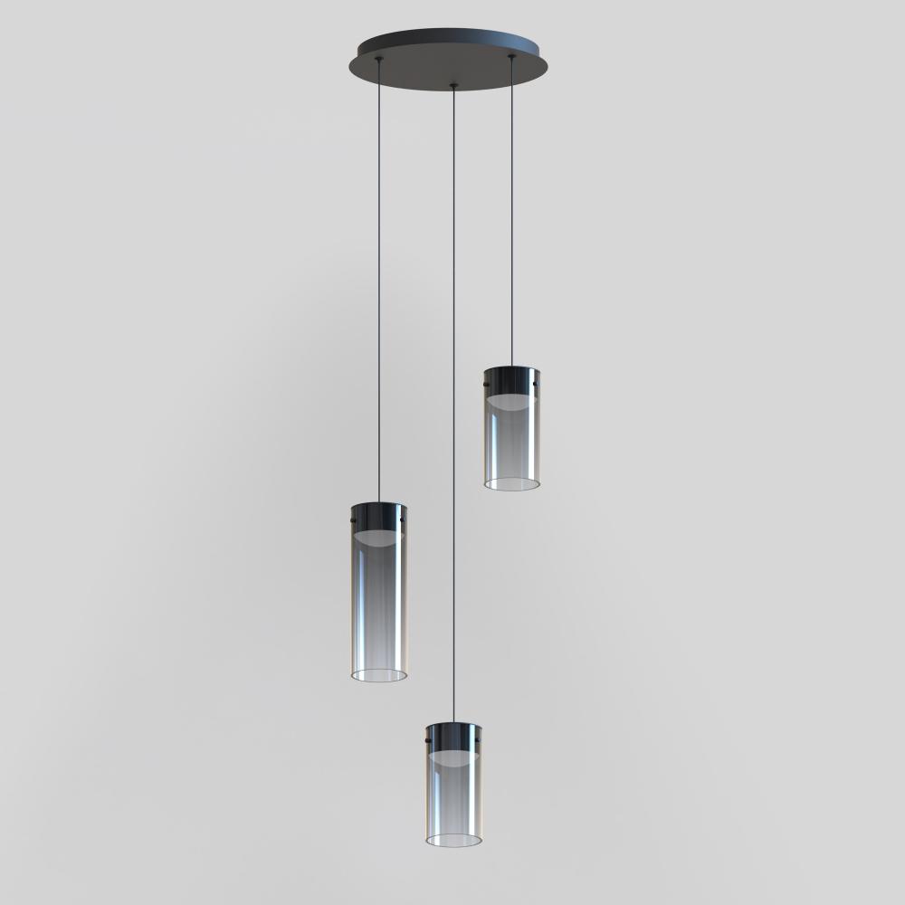 Minimalist in form and futuristic in styling, a gradient color effect applied to cylindrical glass shades provides a dynamic lighting effect. A Polished Gunmetal LED housing supports the glass adds a mirror like effect to the highly reflective glass. The r