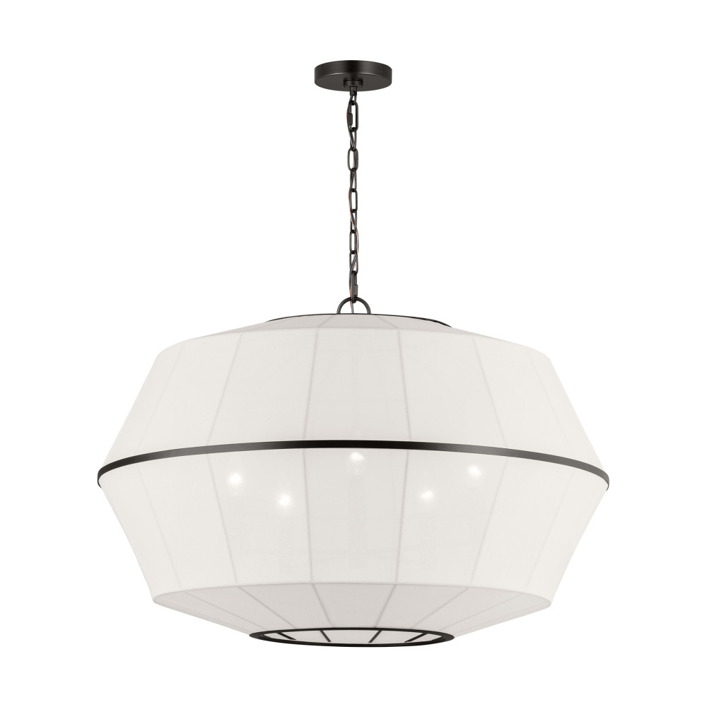 Showcasing multifaceted geometry, the Hikari series by Ellen DeGeneres is inspired by her personal collection of sculptural lighting. Grounded by the contrast of hard and soft materials, the aged iron and white linen fixture radiates soft, diffused light. The Hikari pendant can be used in a dining room, living room, bedroom or entryway.