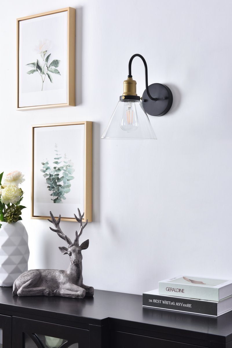 Take a step back through time with the Histoire wall lamp in a brass and black finish. The ever delightful undulating arm supports the clear glass cone shade while light illuminates the surrounding area, creating a beautiful display of charm. A perfect wall lamp to act as your guide in your foyer or living room, or even to light up your bathroom walls, you will always enjoy its captivating light.